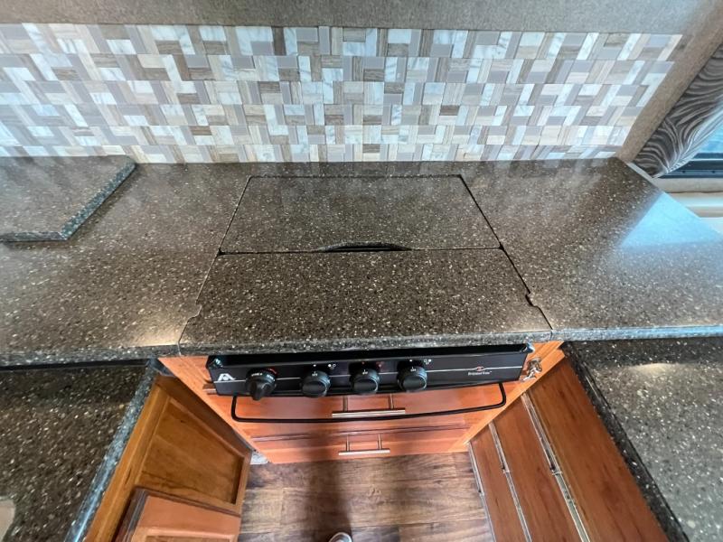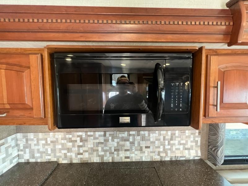 As you step inside to your left you will find an 8 cu. ft. refrigerator and pantry. On the right side of the entrance there is a dinette slide with a 50" TV lift. Opposite the door side you will find a slide out with a tri-fold sofa, a three burner range with overhead microwave oven, counter space, and a double kitchen sink along the interior wall. There are also ample overhead cabinets above the entire slide and above the sink as well.