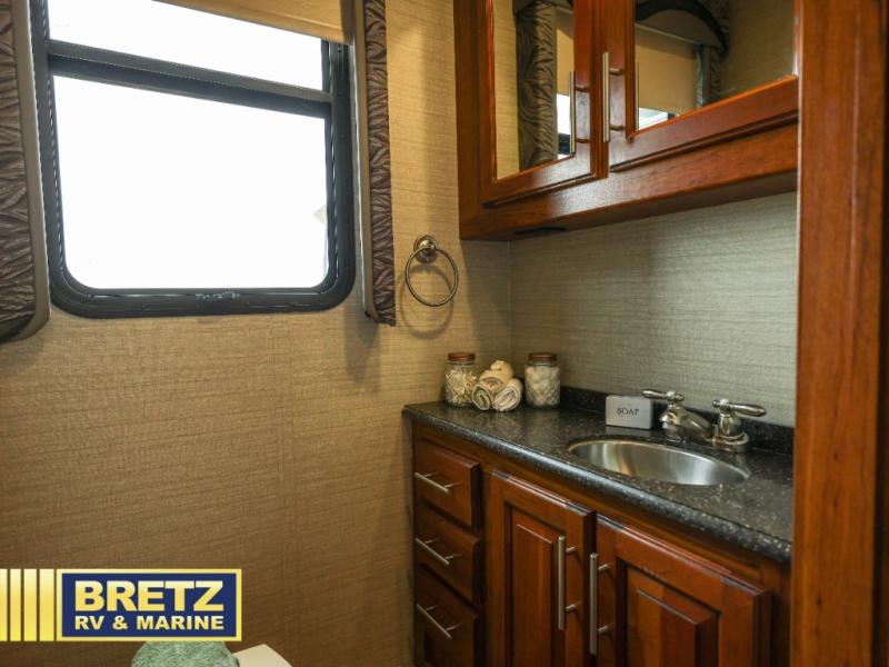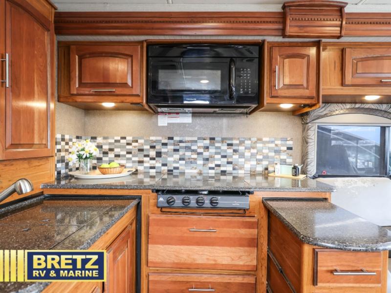 As you step inside to your left you will find an 8 cu. ft. refrigerator and pantry. On the right side of the entrance there is a dinette slide with a 50" TV lift. Opposite the door side you will find a slide out with a tri-fold sofa, a three burner range with overhead microwave oven, counter space, and a double kitchen sink along the interior wall. There are also ample overhead cabinets above the entire slide and above the sink as well.