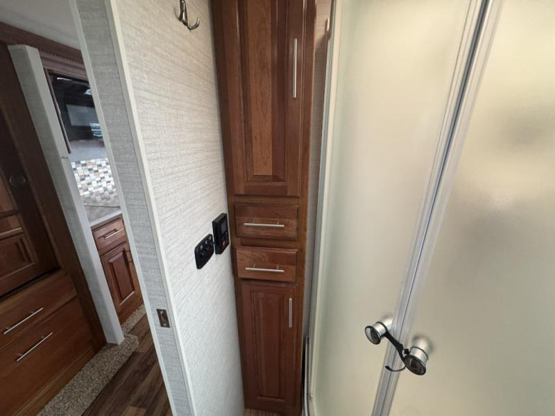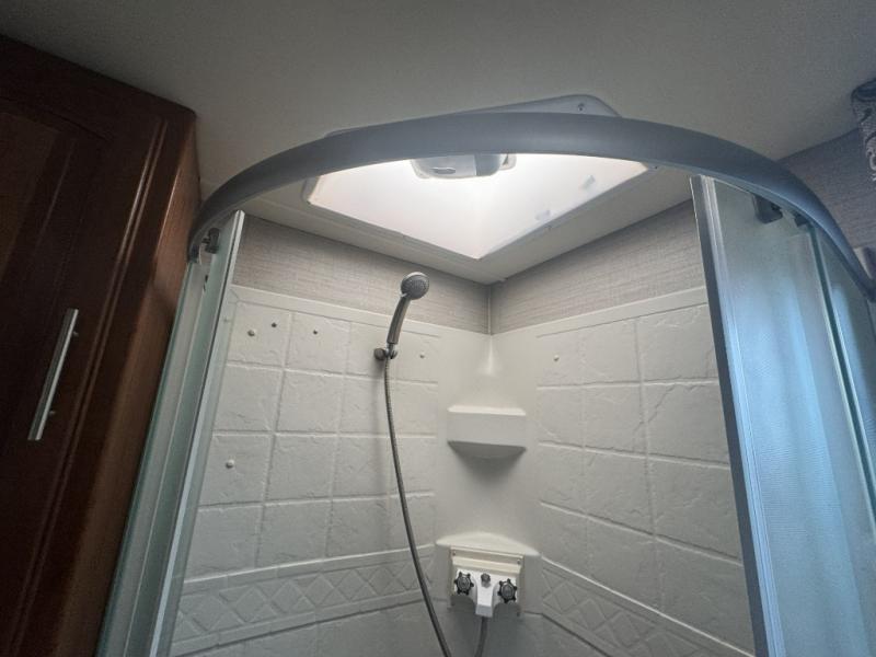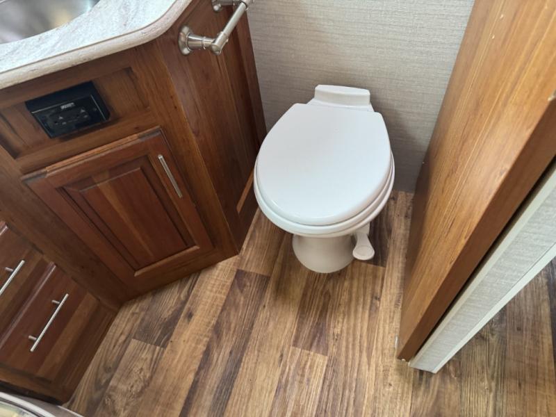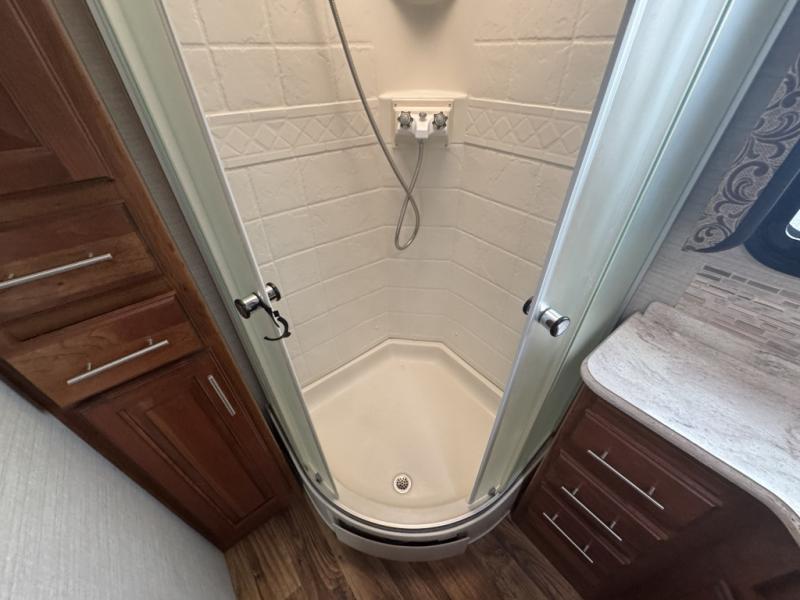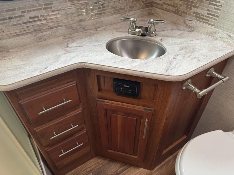 As you head on back to the rear bedroom notice the side aisle bathroom along the curb side just beyond the food pantries. Here you will enjoy getting freshened up each day. The bathroom includes a radius shower, a toilet, vanity with sink, and linen storage as well.