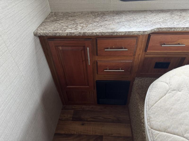 After a fun filled day retreat to the rear bedroom after cleaning up and enjoy a peaceful night's rest on the rear wall slide out queen size bed including overhead storage and a side chest along the road side. There is also a dresser along the curb side, and a 32" TV mounted on the interior wall.
