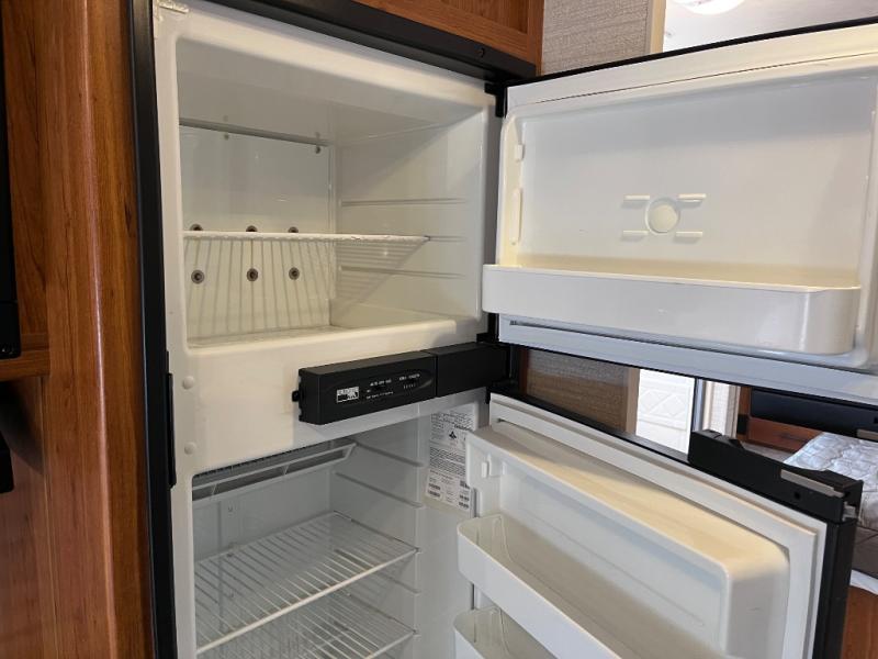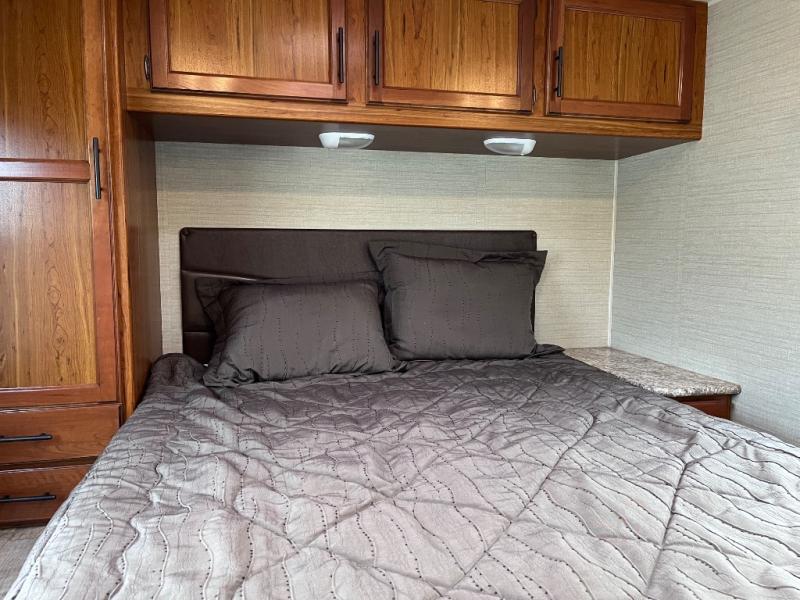 The rear bedroom is very spacious and has a comfortable queen bed, nightstand, and wardrobe. Easily close off the bedroom from the rest of the motor home with the accordion door for a bit more privacy.