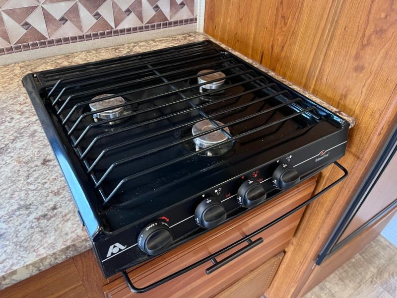 As you enter the motor home, to the left is a nice counter area, double kitchen sink, three burner range, microwave, and refrigerator. The slide has a sofa with an overhead cabinet above the sofa, and a u-dinette. Both the dinette and sofa can easily transform into additional sleeping space at night.