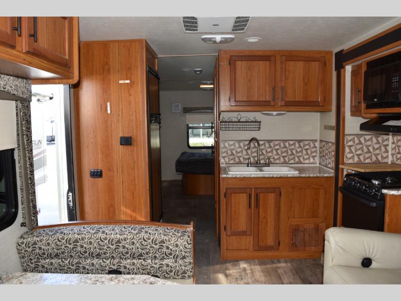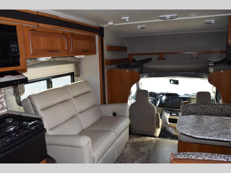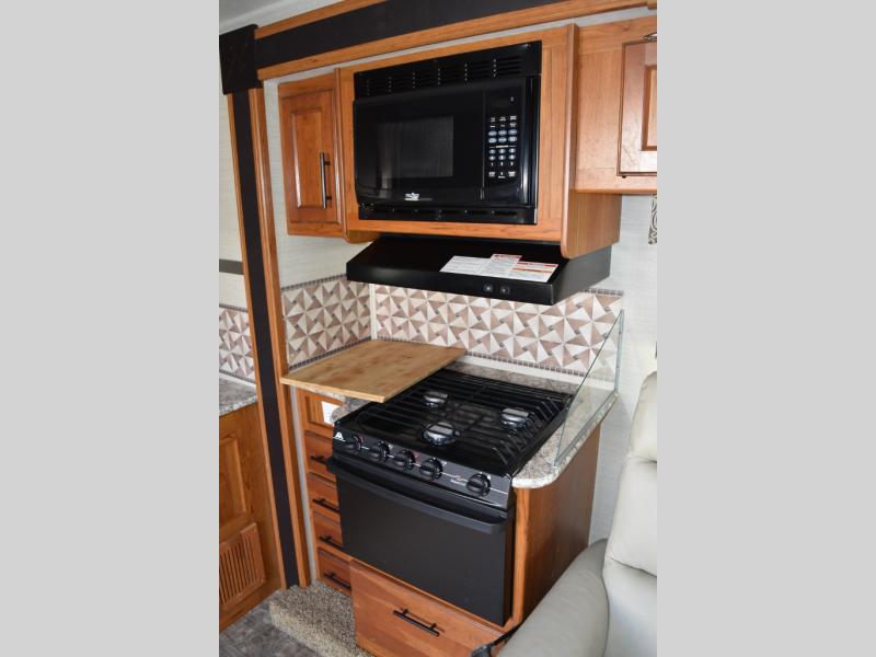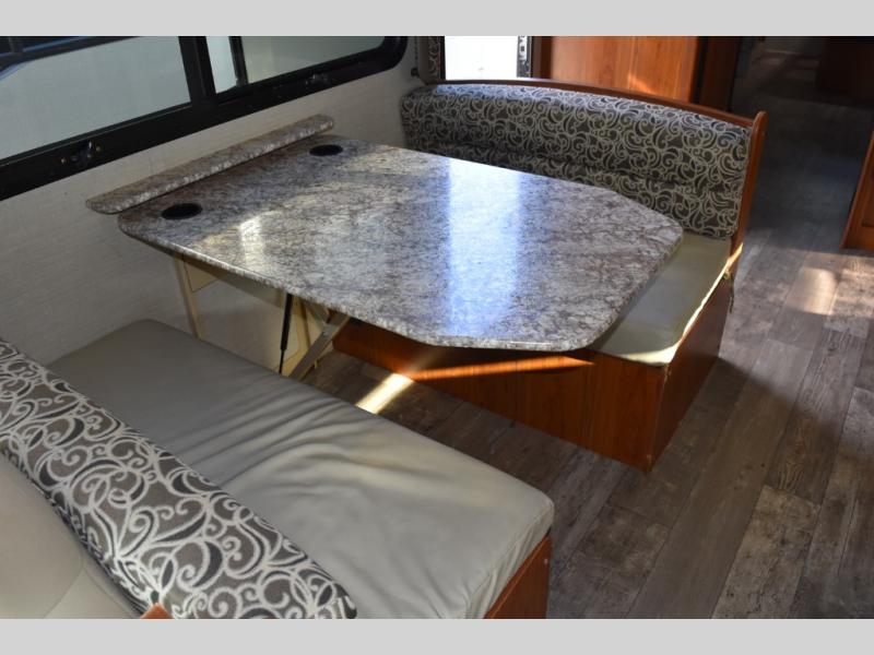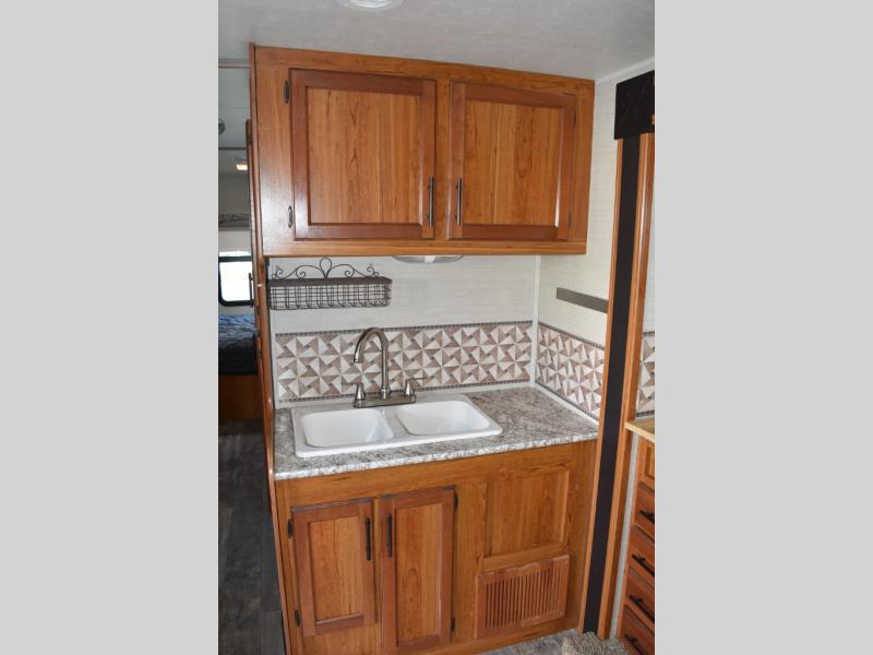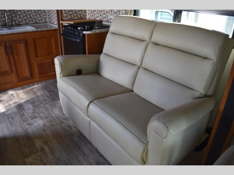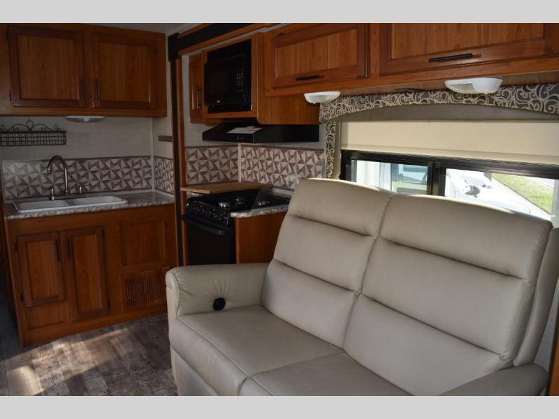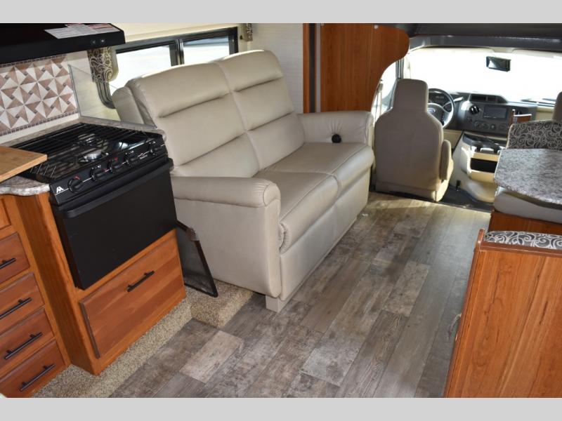 As you enter the motor home, to the right you can enjoy your meals around the dinette, the opposite side has a slide out with a sofa, microwave, three burner range, and overhead cabinet. You will also find adequate counter space and a double kitchen sink. To the left of the entry door there is an 8 cu. ft. refrigerator.