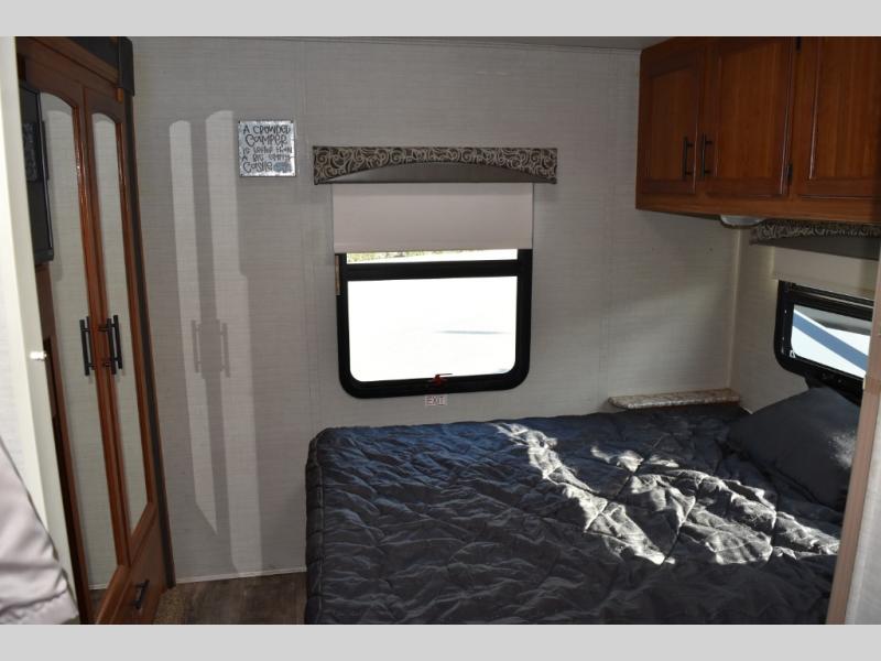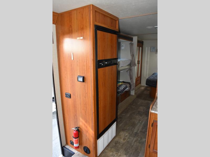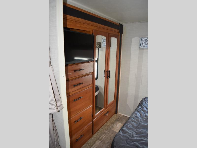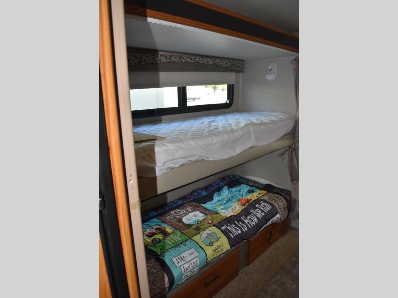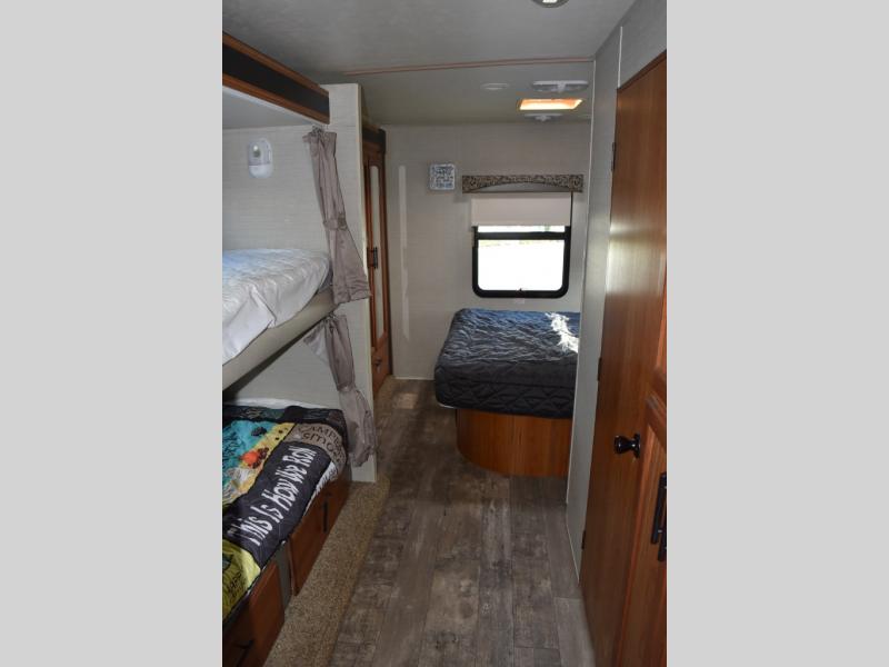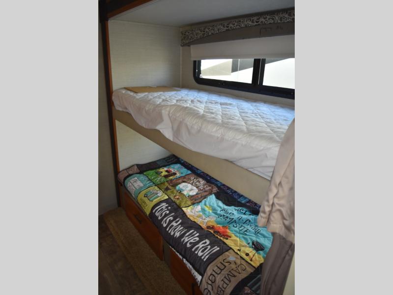 Across from the bathroom there is a slide out with a set of bunk beds which your kids will love! Continuing along the slide and into the bedroom you will find a wardrobe for your hang up clothes. The bedroom also features a queen bed, nightstands, and an overhead cabinet.