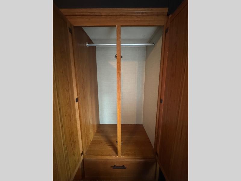 Across from the bathroom there is a slide out with a set of bunk beds which your kids will love! Continuing along the slide and into the bedroom you will find a wardrobe for your hang up clothes. The bedroom also features a queen bed, nightstands, and an overhead cabinet.