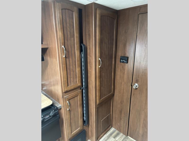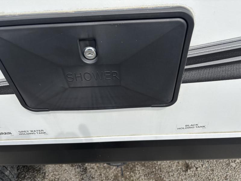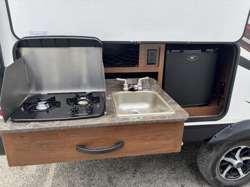The outside kitchen features a pull-out two burner cook-top, single sink, a refrigerator, and counter space. You will also find a 19' awning to help create an outdoor living space just outside the door, plus so much more!