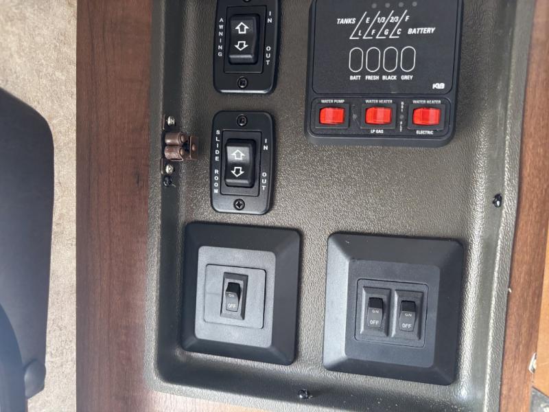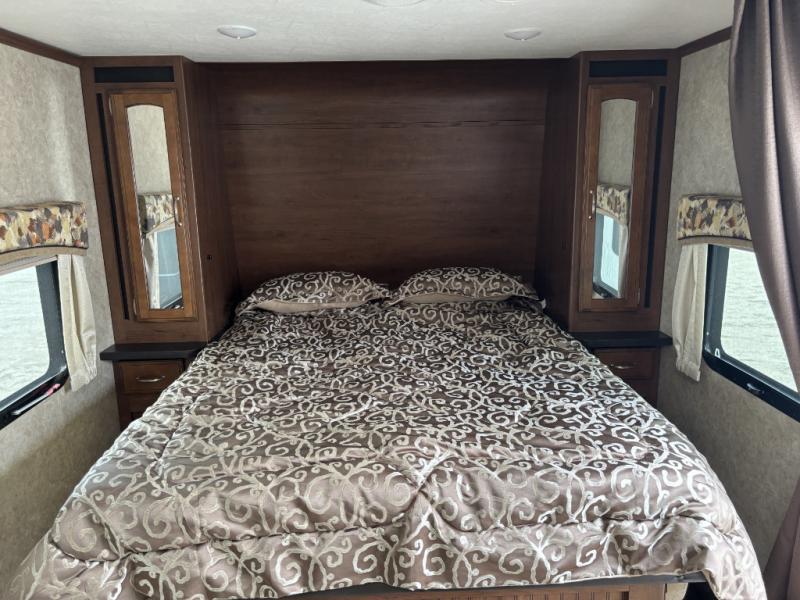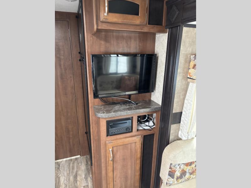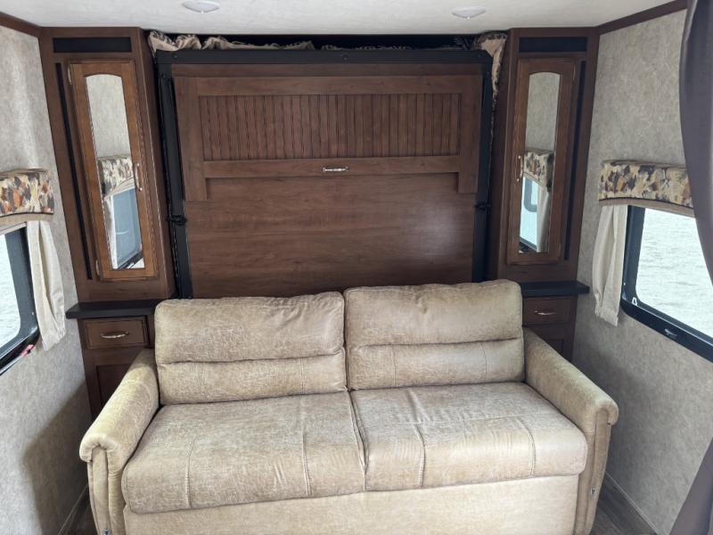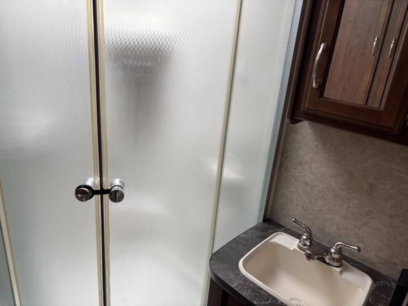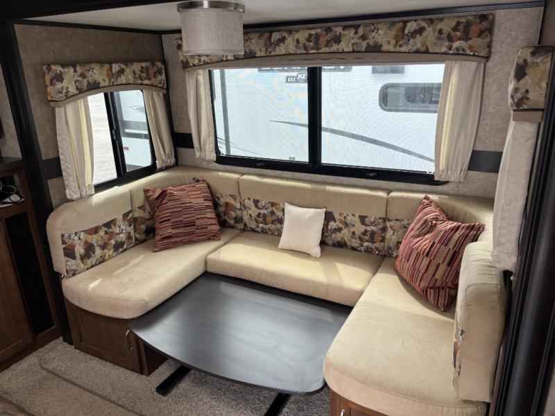 Straight in the front entry door find a slide out u-shaped dinette that offers added floor space when fully extended. The dinette is great for enjoying your meals at, and can easily be turned into added sleeping space for the kids or overnight guests. A nearby TV base can easily be viewed from the sofa, bed, or dinette.