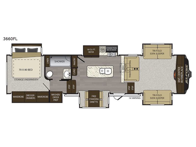 SIX slides in a fifth wheel? You will be amazed at the space inside this Alpine fifth wheel by Keystone RV. Model 3660FL has a front living room layout and slides that provide maximum space in every area of this unit.