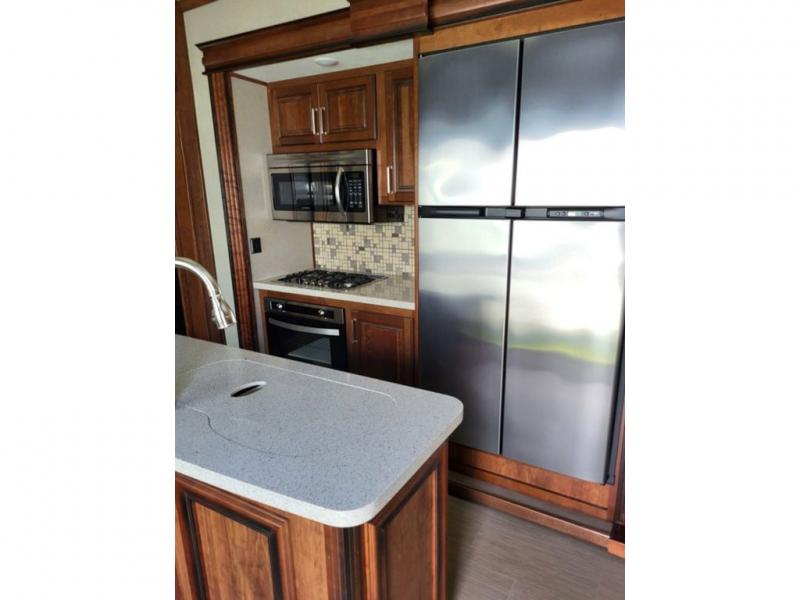 Step inside and find yourself in a kitchen that is as spacious as home. There is a free standing dinette slide with four chairs to the left of the door, a large kitchen island with double sink, and a second slide featuring a double door 18 cu. ft. refrigerator, three burner range, and convection microwave. Plus, there is a pantry off to the side as well as two curios, a dishwasher, and overhead cabinets throughout for dishes and things.