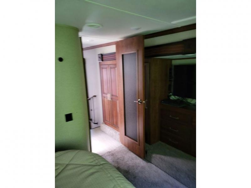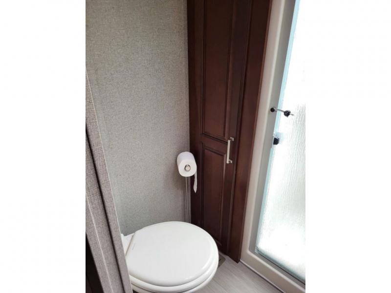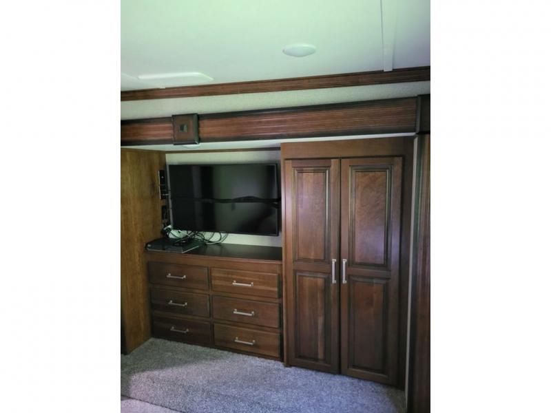 The bedroom features a king bed slide with storage underneath on the road side, and dual wardrobes with dresser drawers on the opposite side slide out. Plus there is a washer/dryer prepped location within the bedroom slide that is accessible from the hall across from the bath.