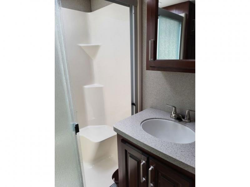 Head up the steps to your right from the kitchen to a front living space also featuring dual slides. There is an entertainment center with a fireplace along the front wall. In the living room you will find dual opposing slides, and each slide has a tri-fold sofa sleeper. Across from the entertainment center there is theater seating with cup holders. The perfect place to entertain, relax, and provide sleeping space for extra guests if needed.