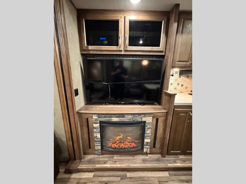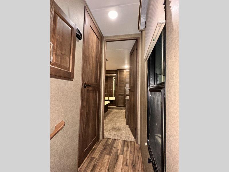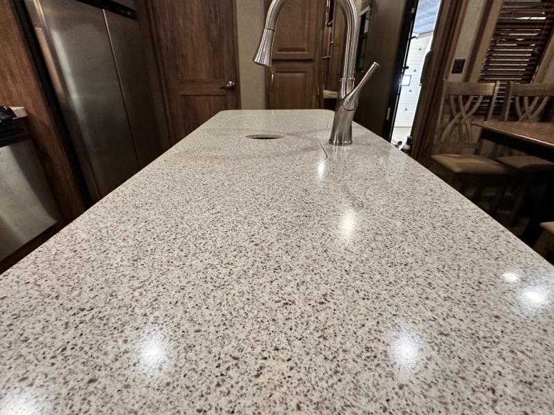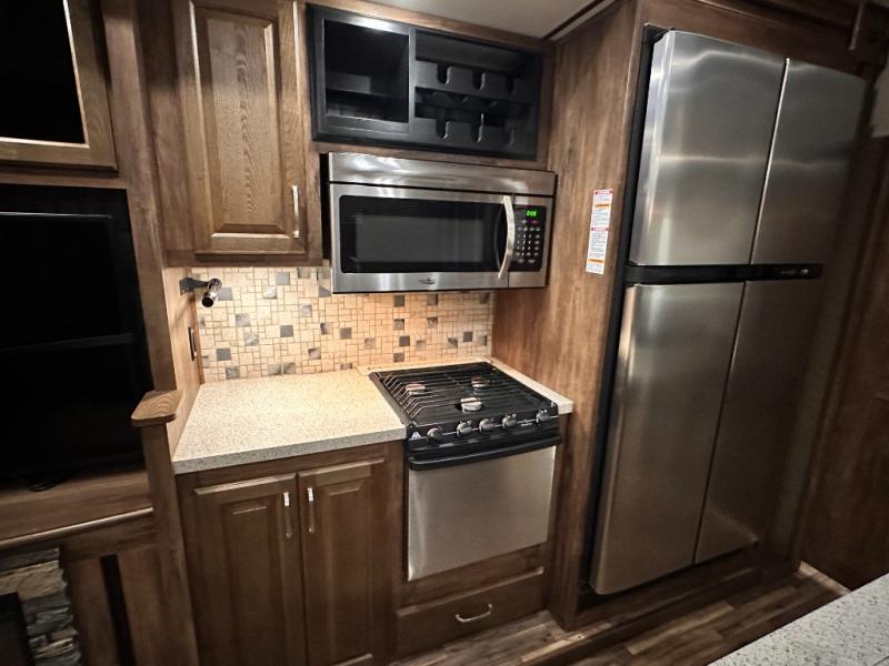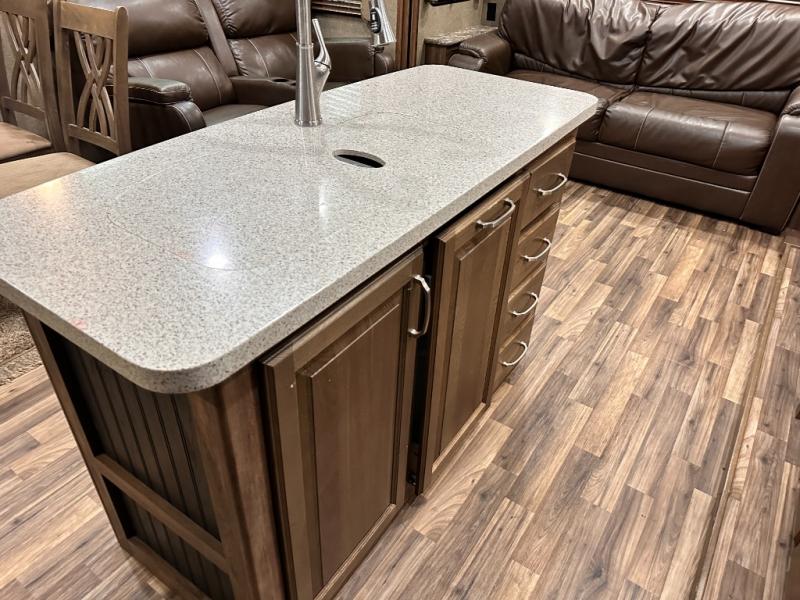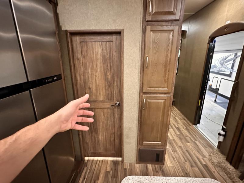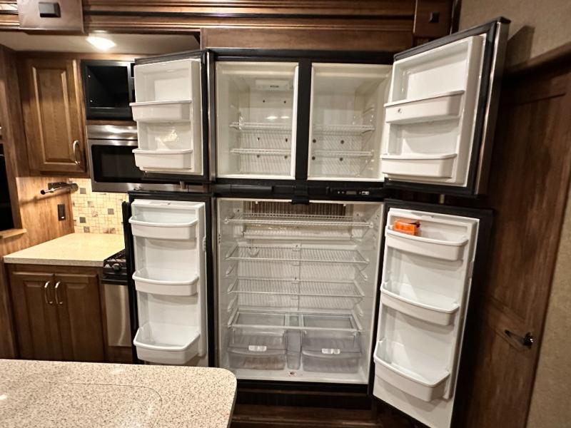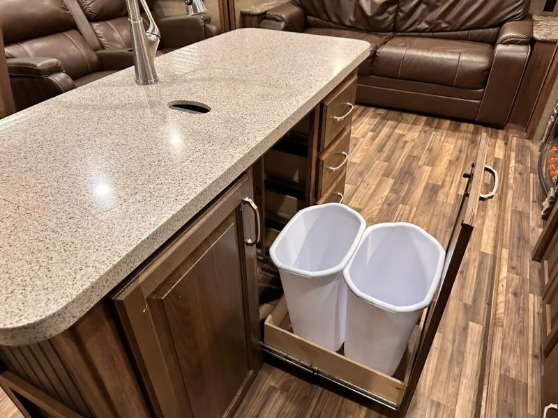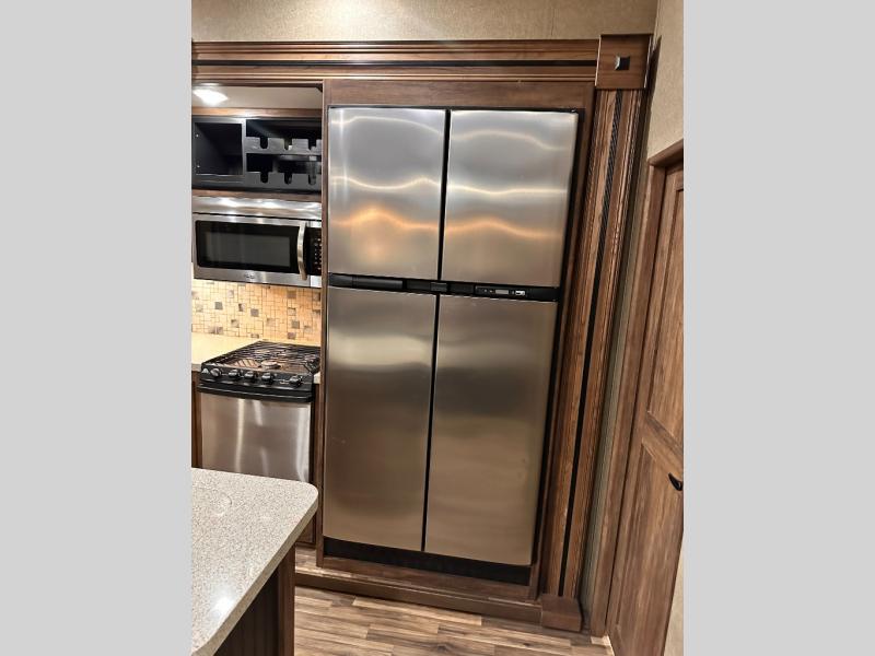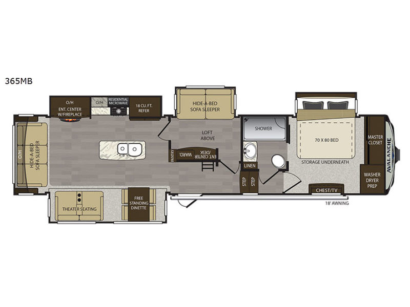 Head to the rear of this Avalanche fifth wheel from just inside the main door to find a combined kitchen and living space. There is a slide out free standing dinette with chairs and theater seat for two just inside the door. On the opposite side another slide featuring a entertainment center with fireplace and overhead storage, plus the kitchen appliances including a three burner range, residential microwave, an 18 cu. ft. refrigerator, and storage. A nice island in the center provides a double sink and more counter space, as well as storage which you can also find along the outer corner of the middle bedroom where there is a pantry for your dry and canned goods.