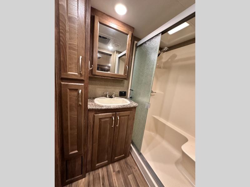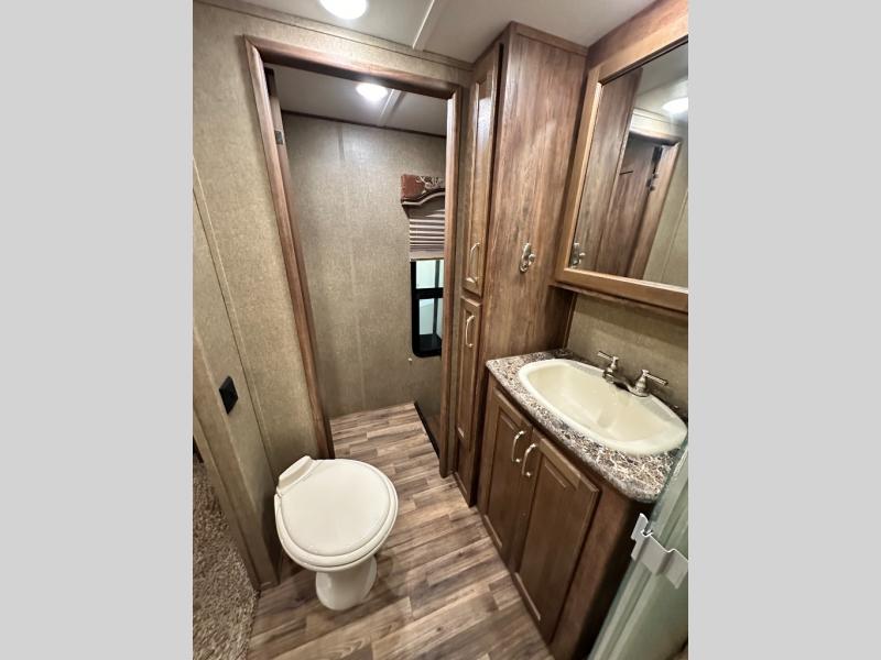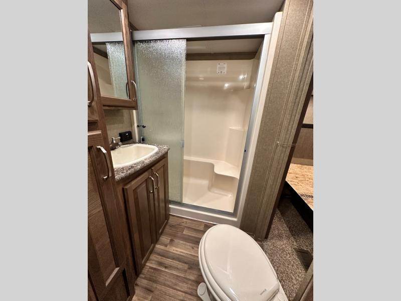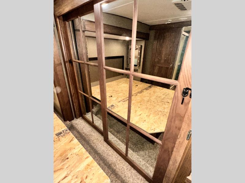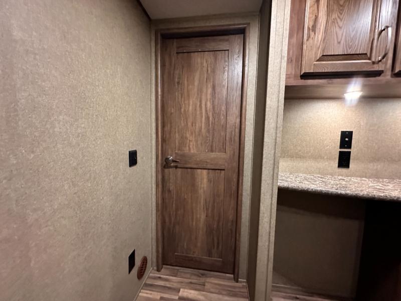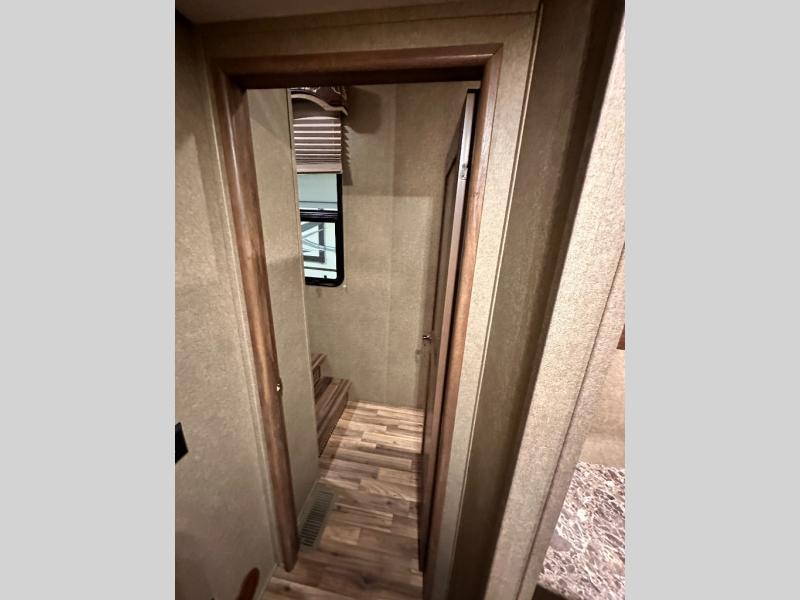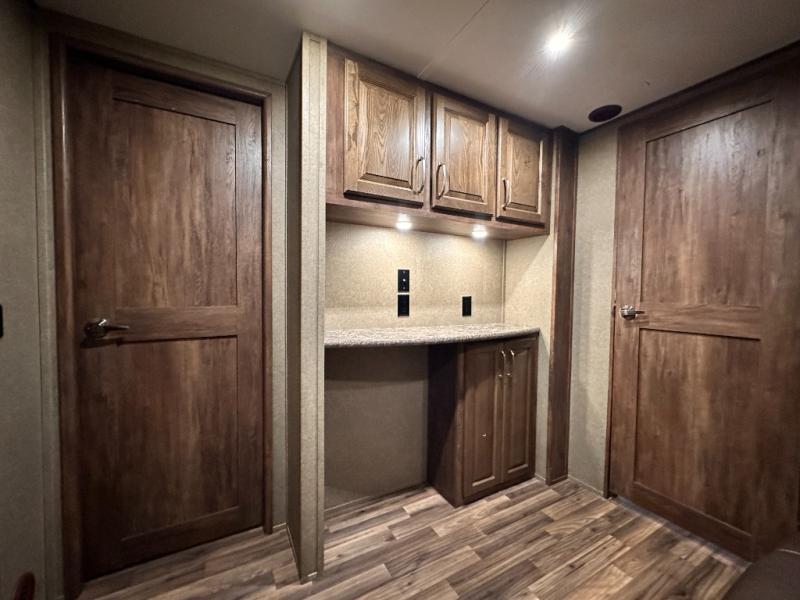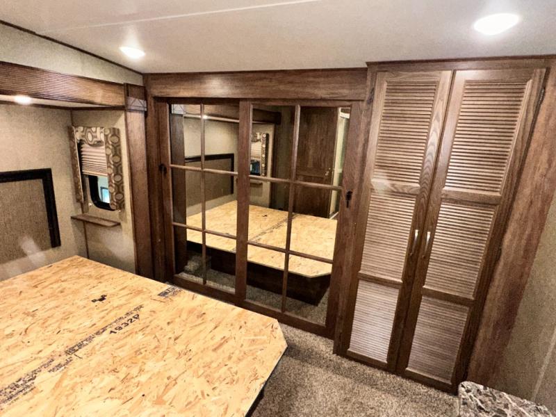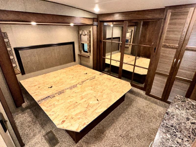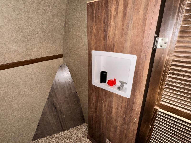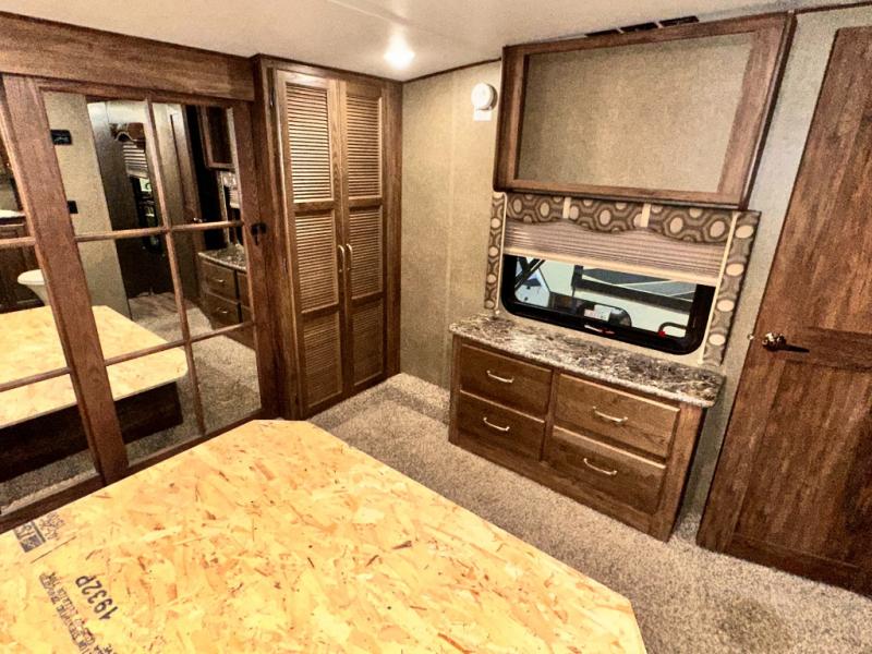 The master bedroom provides a king bed slide out with storage underneath, and a front master closet including a second closet that has been prepped for a washer and dryer. There is also a chest of drawers opposite the bed along the curb side wall so you can easily tuck away all of your things.