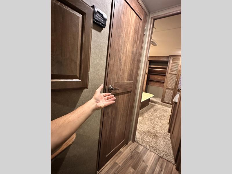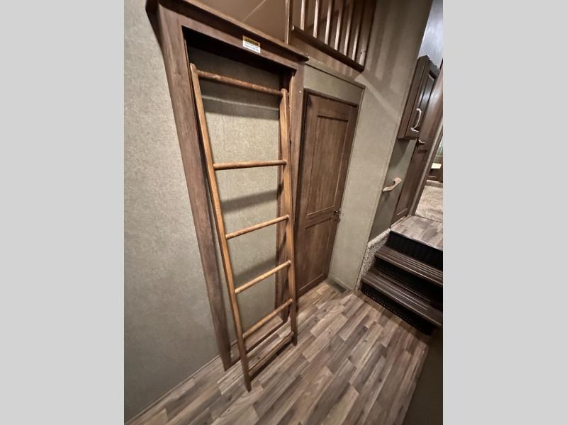 Step inside and slightly to your right there is a door into the middle bedroom that features dual entry, a slide out hide-a-bed sleeper sofa, a wardrobe for clothing, and an entertainment center with a desk. There is also a loft above this room including access with a ladder out in the hall opposite the main entry.