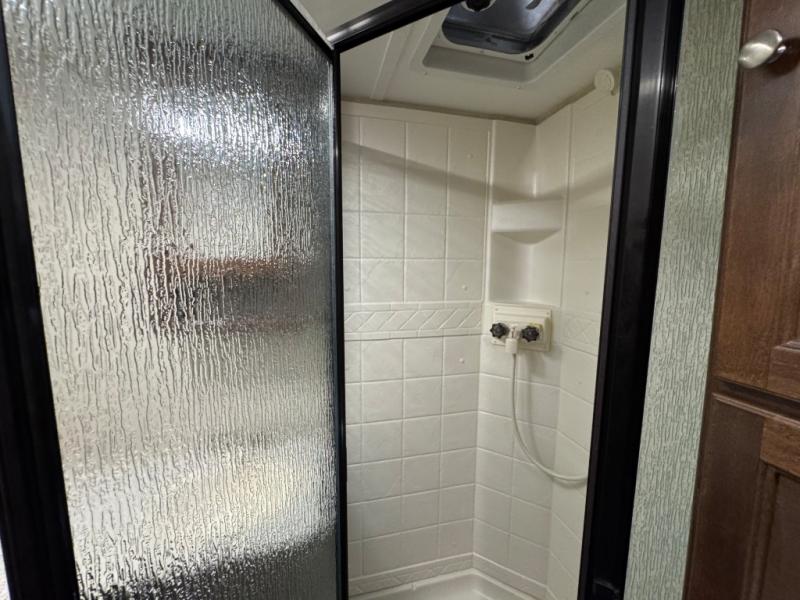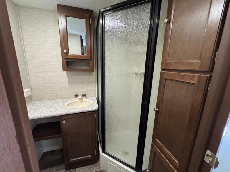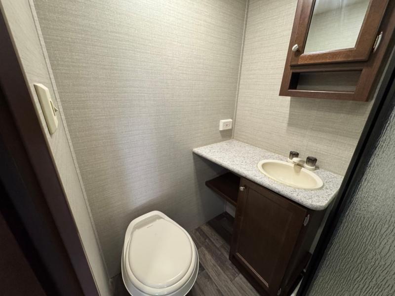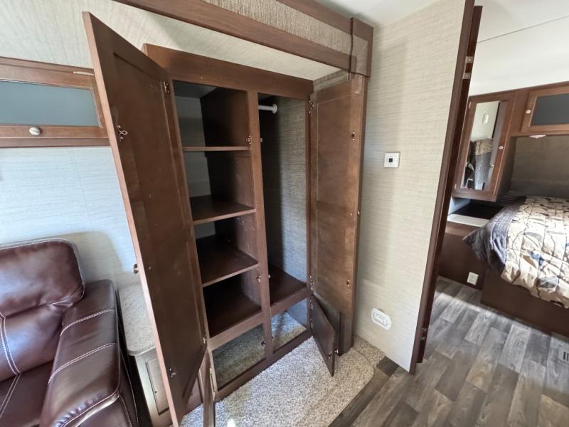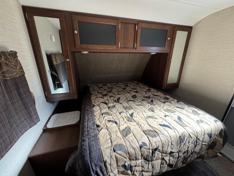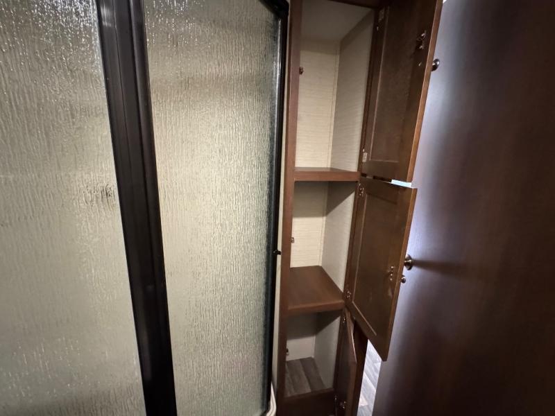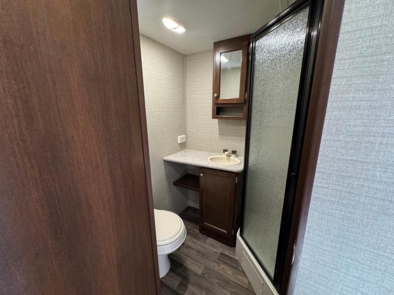 In the front you will find a private bedroom with a comfy queen bed including wardrobes on either side of the bed, along with a laundry chute and an overhead cabinet for more storage. There is also a private bedroom entry/exit door to the outside for your convenience.