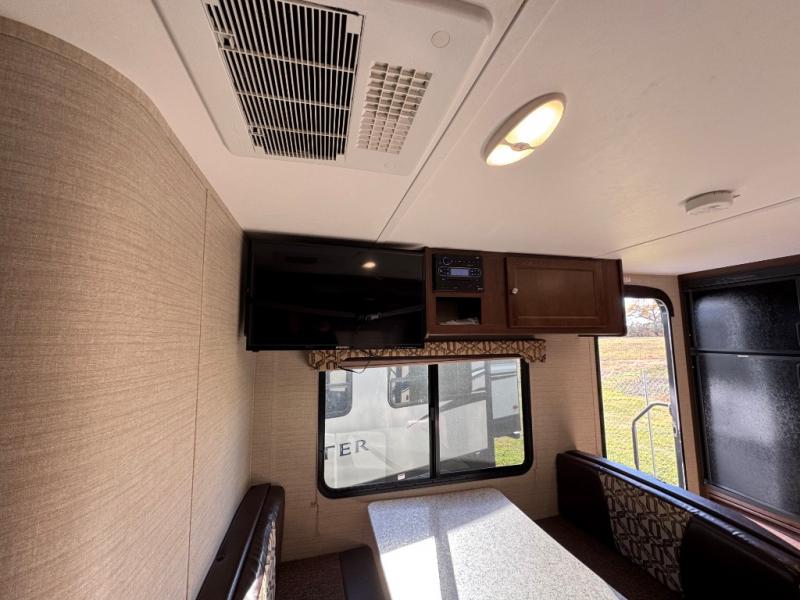 Dine comfortably on the booth dinette just to the right of the entry door. There is also an overhead cabinet for storage plus an LCD TV above for viewing from the sofa on the opposite side of the room.