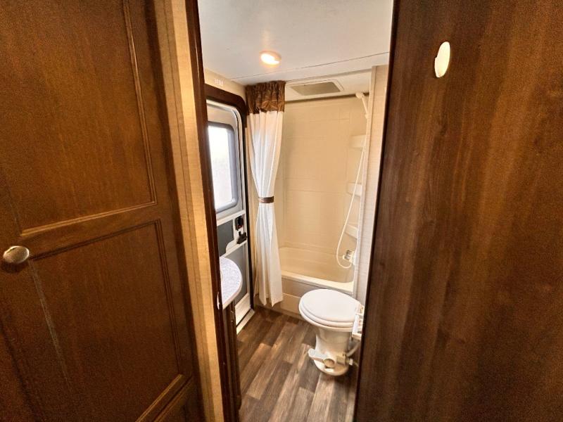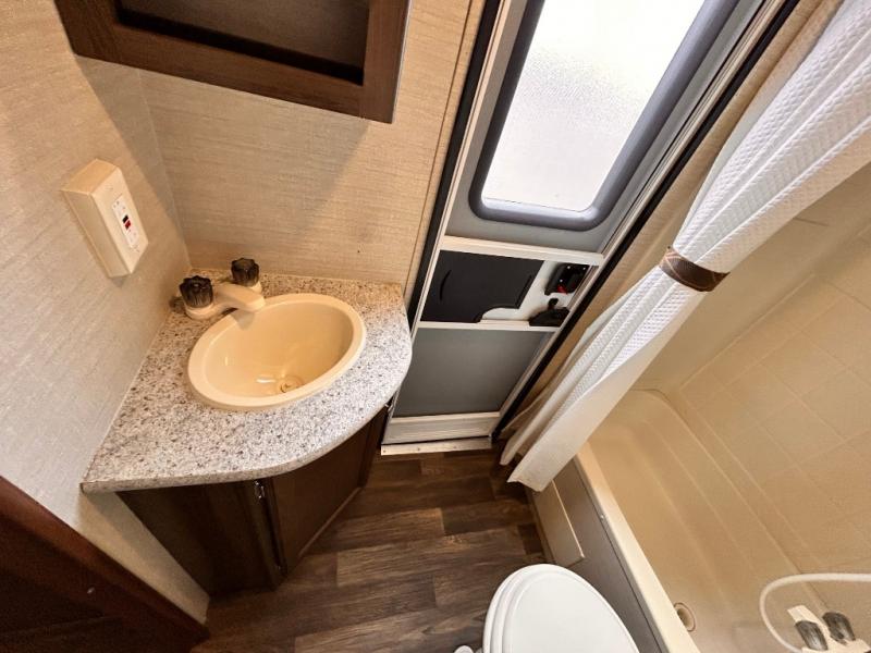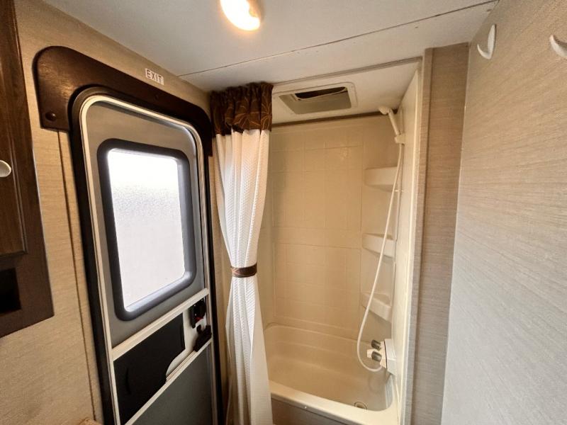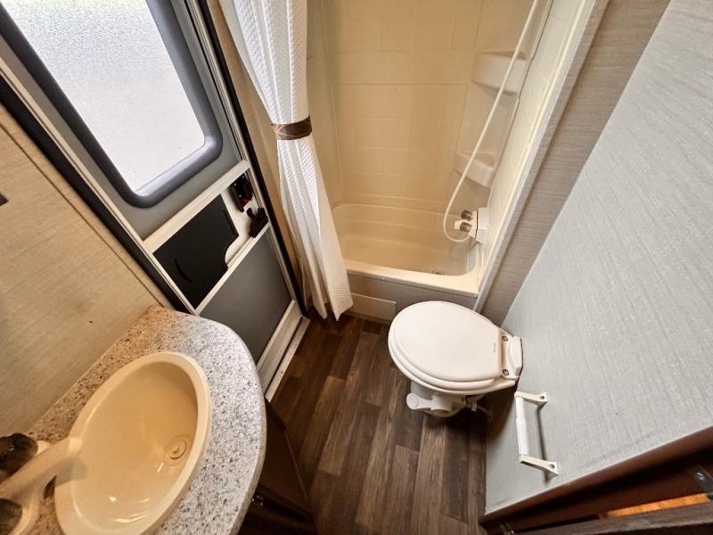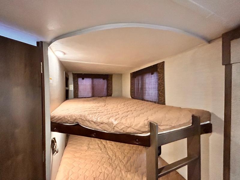 In the rear there is a a set of double size bunks with an angled corner and ladder for accessing the top bunk, plus a privacy curtain. The opposite rear corner features a full bath with private entry from outside, and includes a tub/shower, toilet and sink.