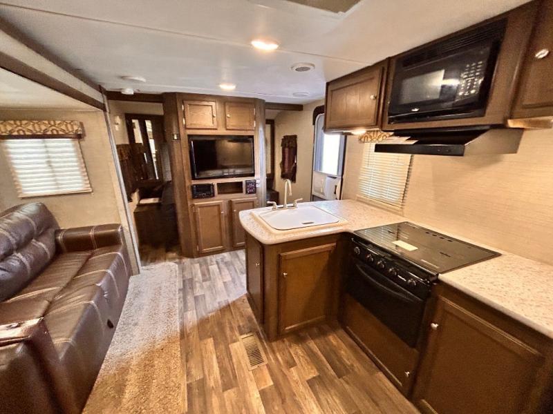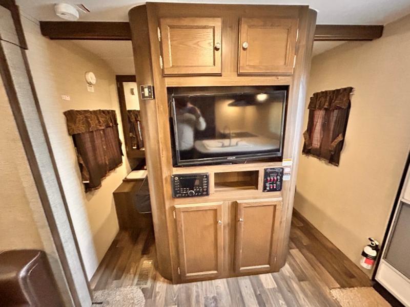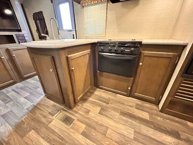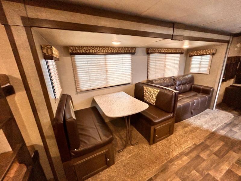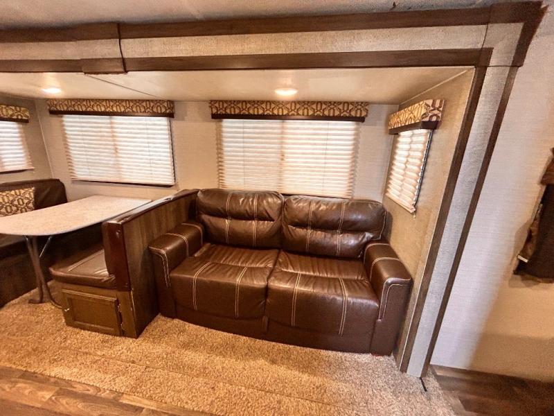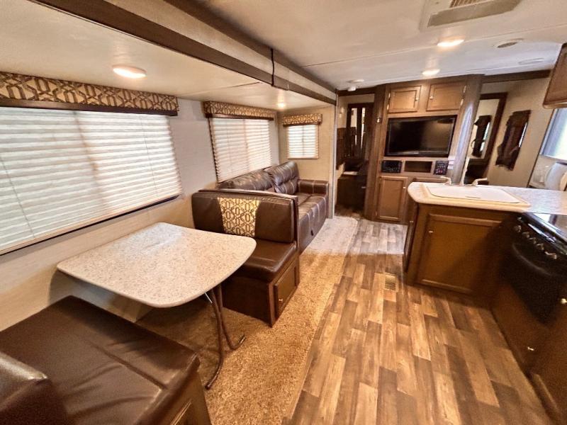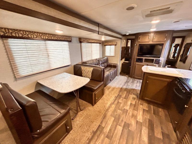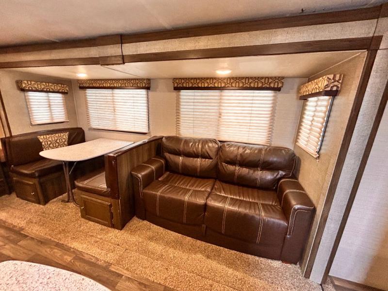 Step inside the main entry door closest to the front of the trailer to find a spacious interior with large slide out 68" sofa and booth dinette. When it's time for relaxing, the entertainment center is along the interior center wall facing the kitchen/living area.