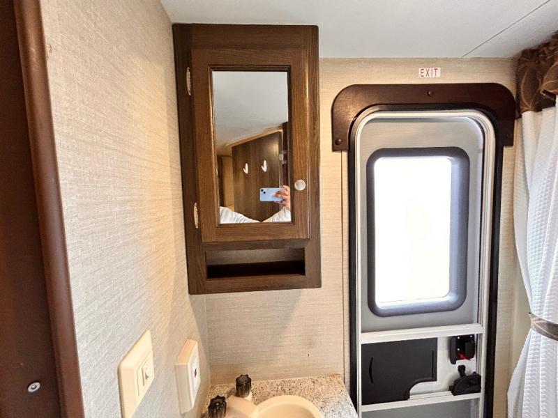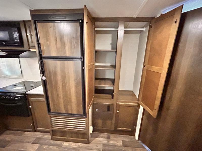 On the curb side you will find a kitchen that has everything you need to create gourmet meals and snacks on the go. There is a refrigerator, three burner range, overhead storage, and large kitchen sink on a L-shaped counter. There is also plenty of overhead storage space for dry goods, dishes, and so much more. You will find even more storage next to the refrigerator with a double door pantry/wardrobe.