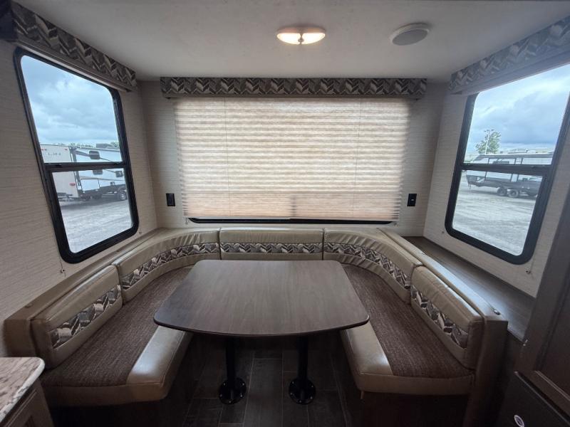 The kitchen includes a two burner range, microwave, large single sink, counter space, and overhead storage along one side, and a refrigerator and pantry along the road side. A large u-shaped dinette and end table cover the rear of the trailer. The dinette can also be made into extra sleeping space at night.
