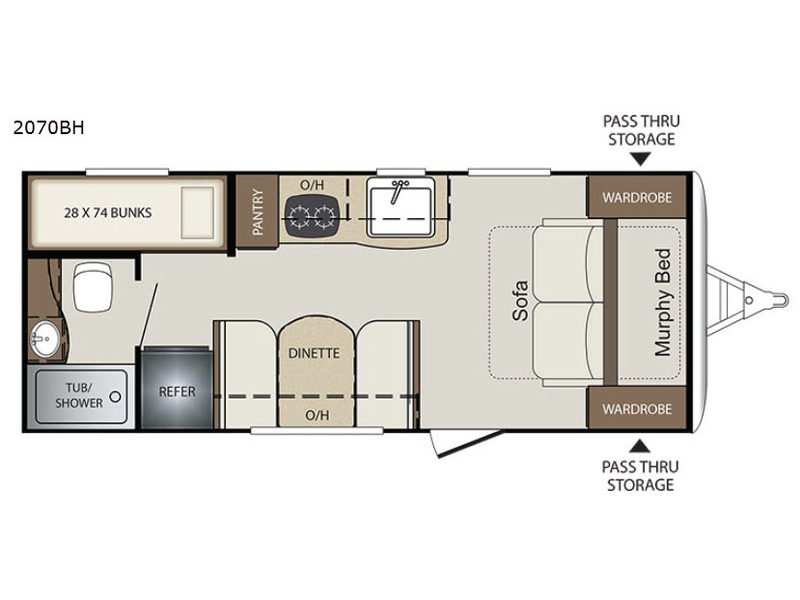 This Bullet Crossfire 2070BH features a set of bunk beds and a bath in the rear of the travel trailer, plus includes a Murphy bed!