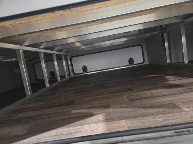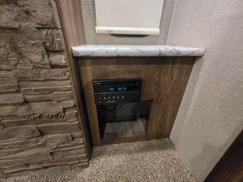 Located in the rear of this model is the living area. Here you will find dual opposing slides with tri-fold sleeper sofas and overhead cabinets. There are also theater seats with cup holders, and along the rear wall enjoy the entertainment center, and more!