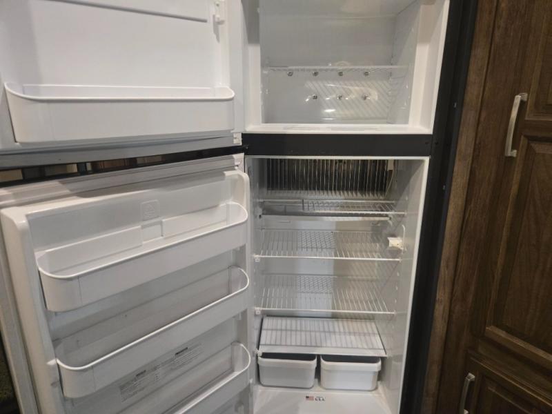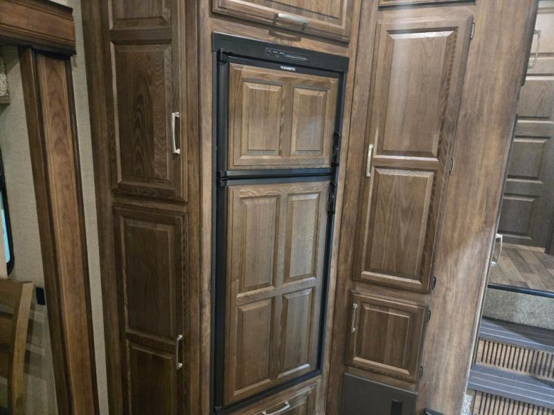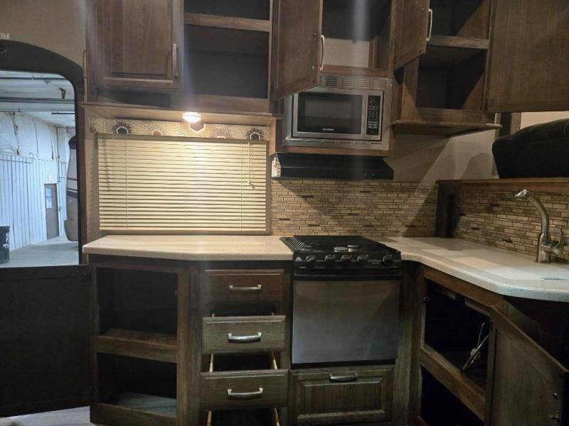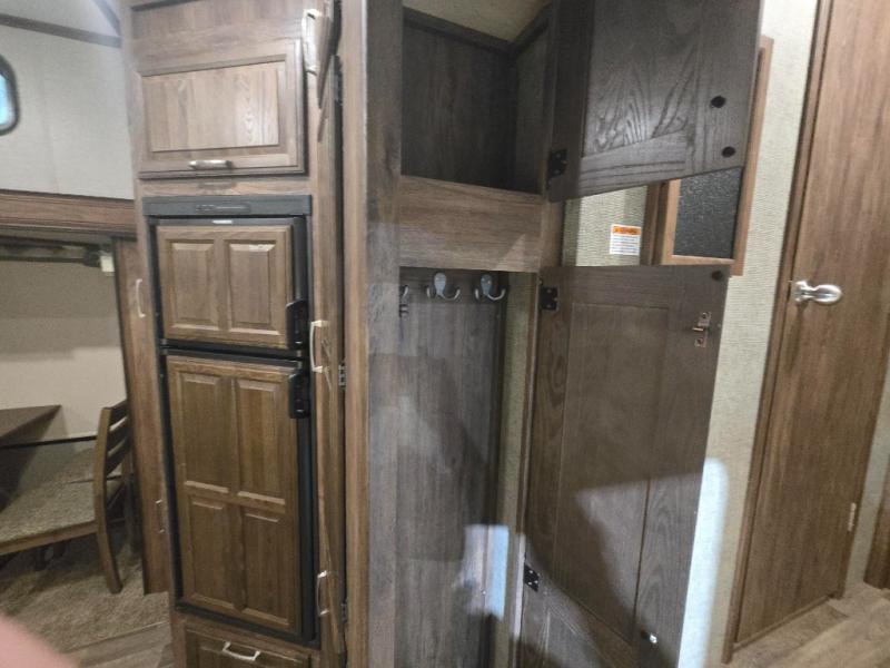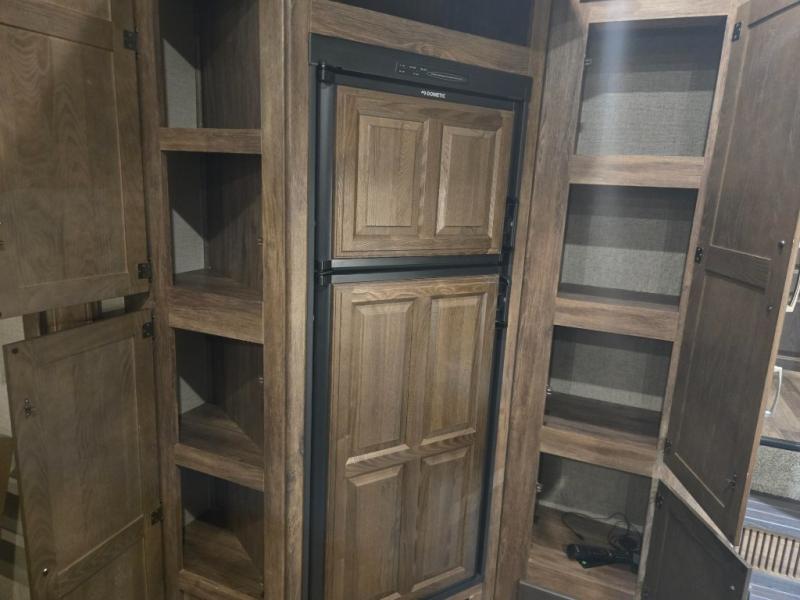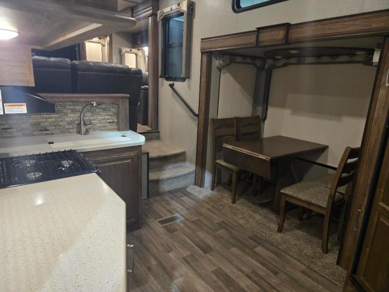 As you enter the fifth wheel, to your left there is counter space for food prep, overhead cabinets, three burner range, and double kitchen sink. On the opposite side the road side slide has a free-standing dinette. Adjacent to the slide there is a pantry, refrigerator, and an additional pantry.