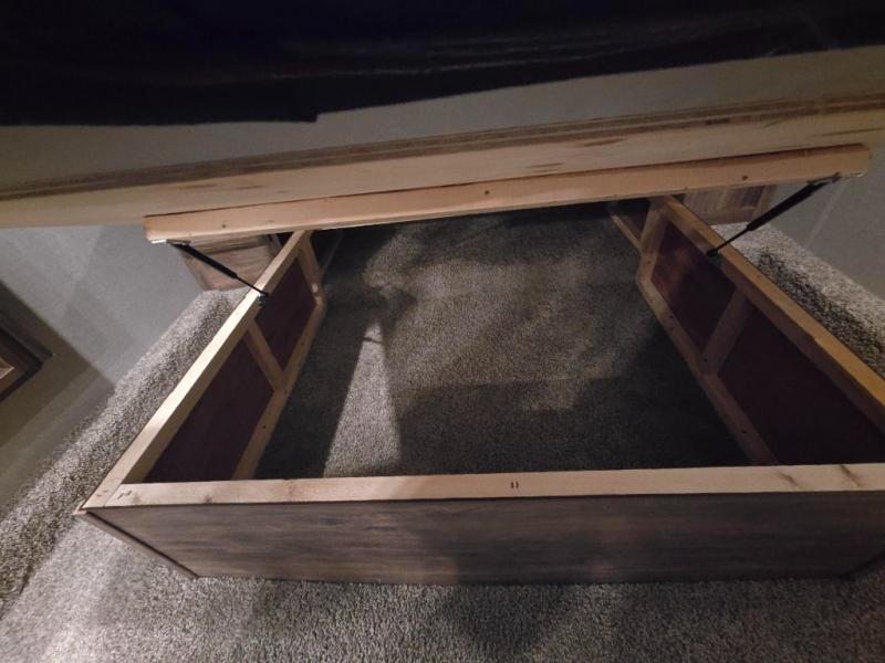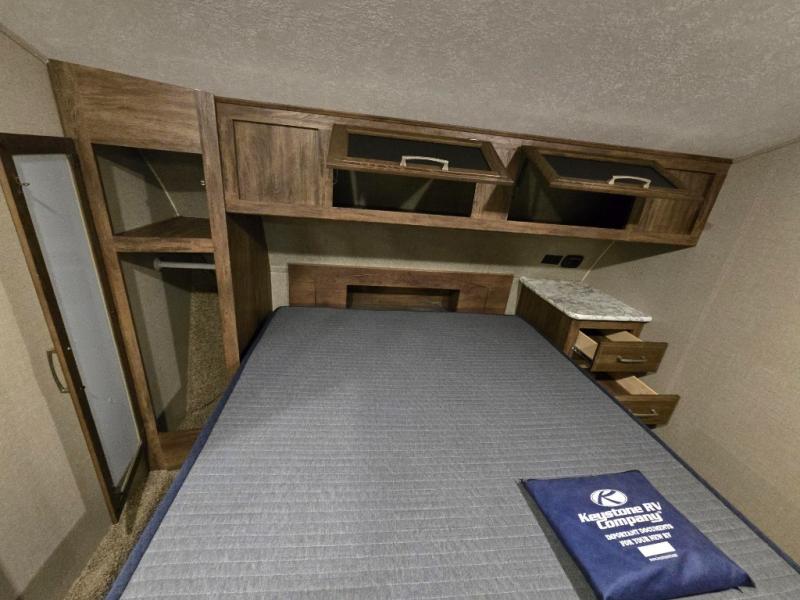In the bedroom there is a queen bed, nightstand, wardrobe, overhead storage, and a slide with a wardrobe and linen cabinet. You can also access the linen cabinet from the bathroom.