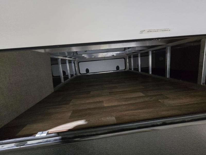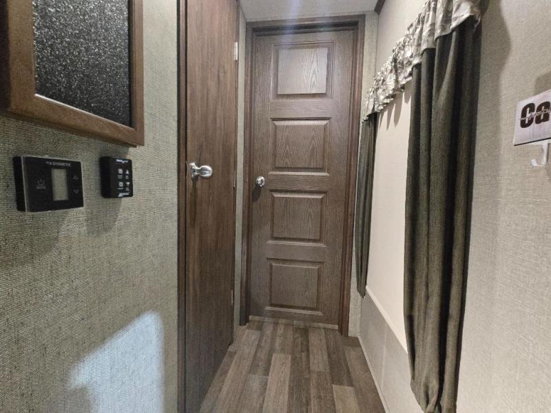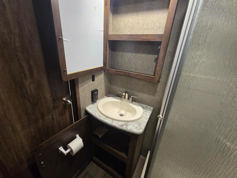 Step up to the bathroom and bedroom area. The side aisle bathroom is on your left. Inside the bathroom you will find a sink, medicine cabinet, neo-angled shower, and a toilet. There is a sliding door that separates the bathroom from the bedroom.