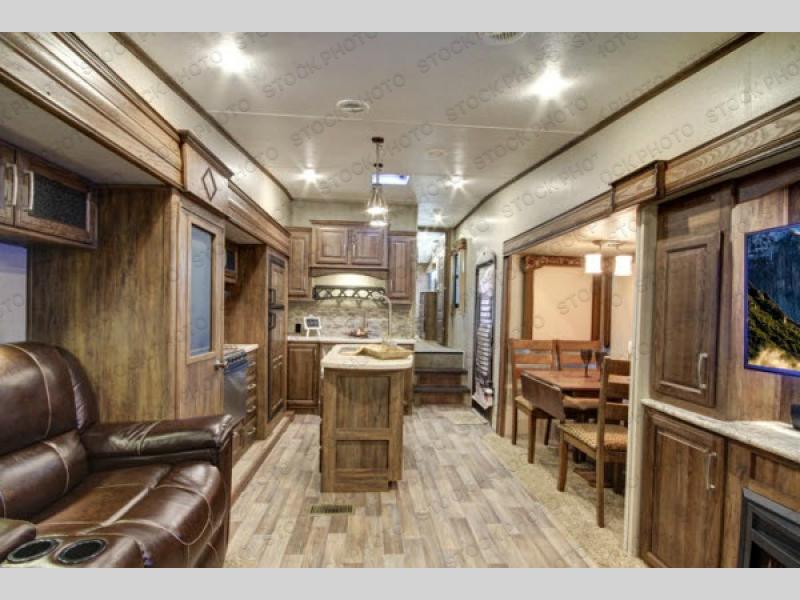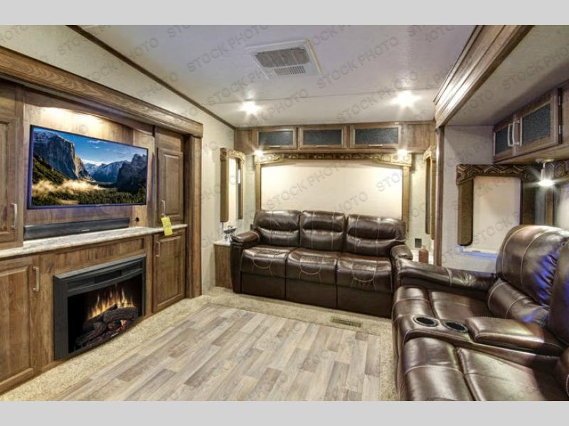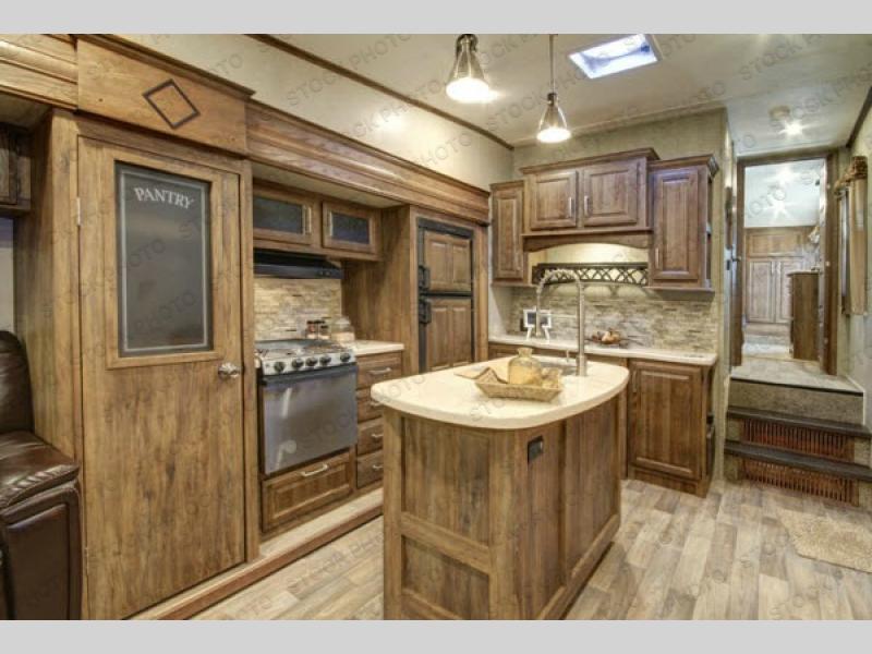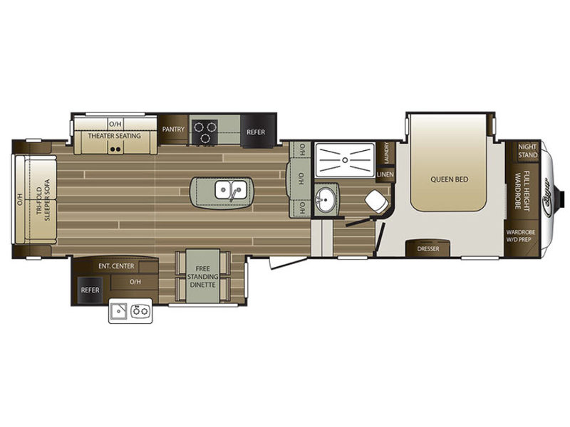 Stepping inside this model, you will be in the combined kitchen and living area. The dual opposing slide outs help to open up the floor space. Along the door side of the fifth wheel the slide features a free-standing table with four chairs, and an entertainment center for your enjoyment. Along the road side the slide features theater seats with overhead cabinets, a large pantry, three burner range, and a refrigerator for your perishables. Along the interior wall you will find extra counter space and overhead cabinets. The island has a double sink, and along the rear wall of this model more seating can be found on the tri-fold sleeper sofa. There is also overhead cabinets running the width of the fifth wheel.