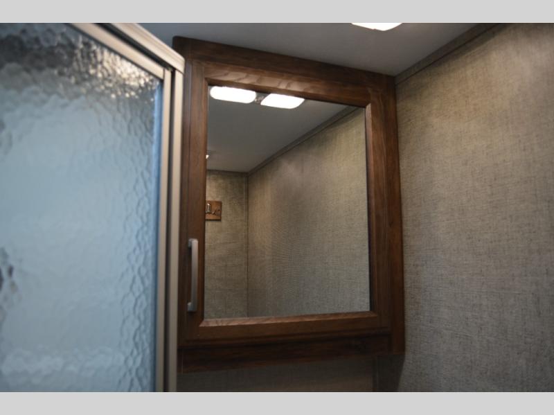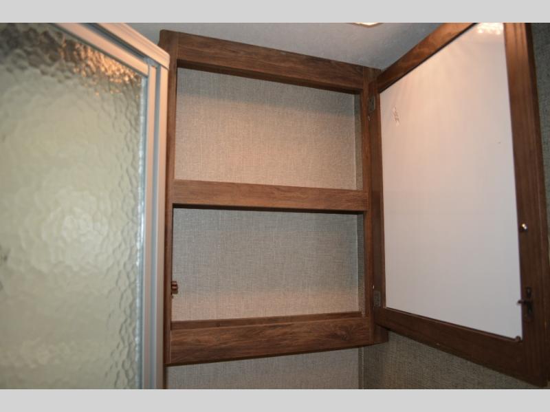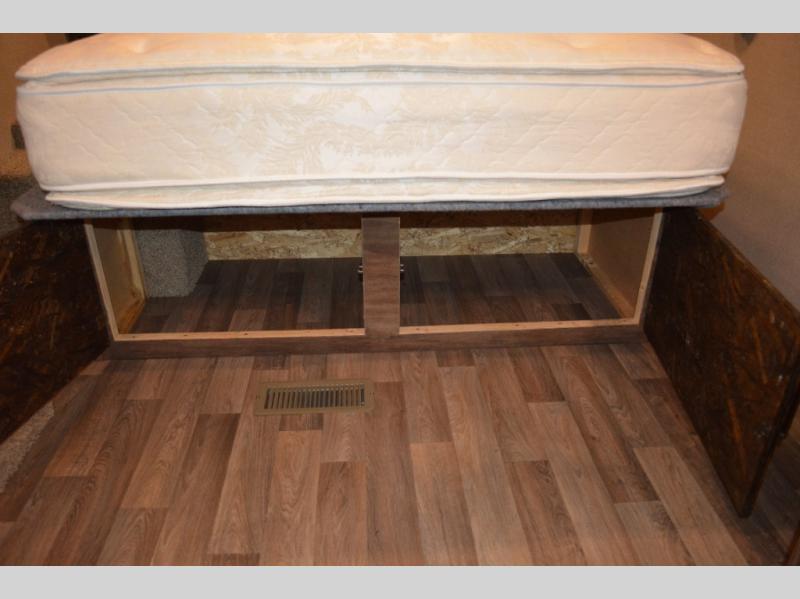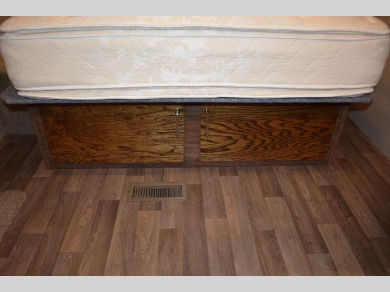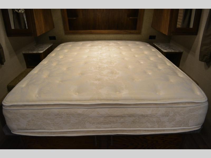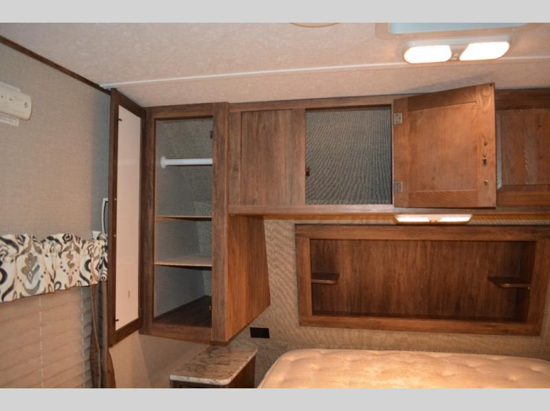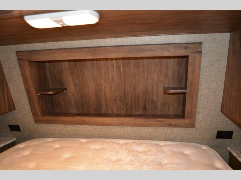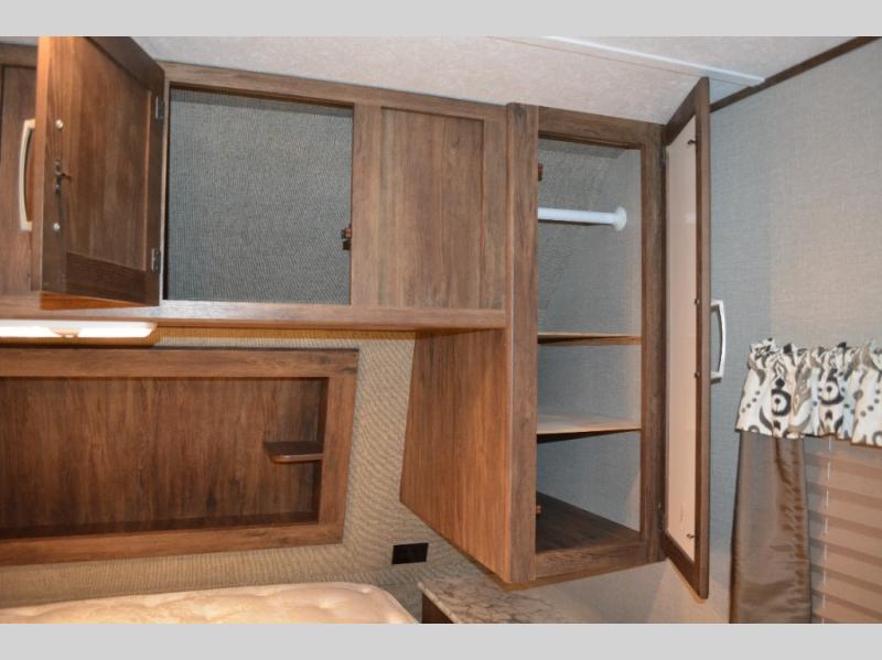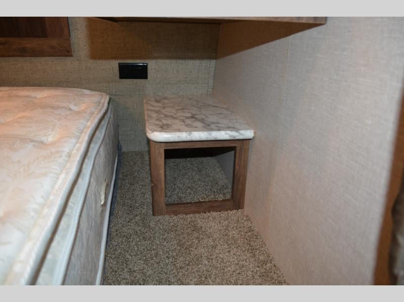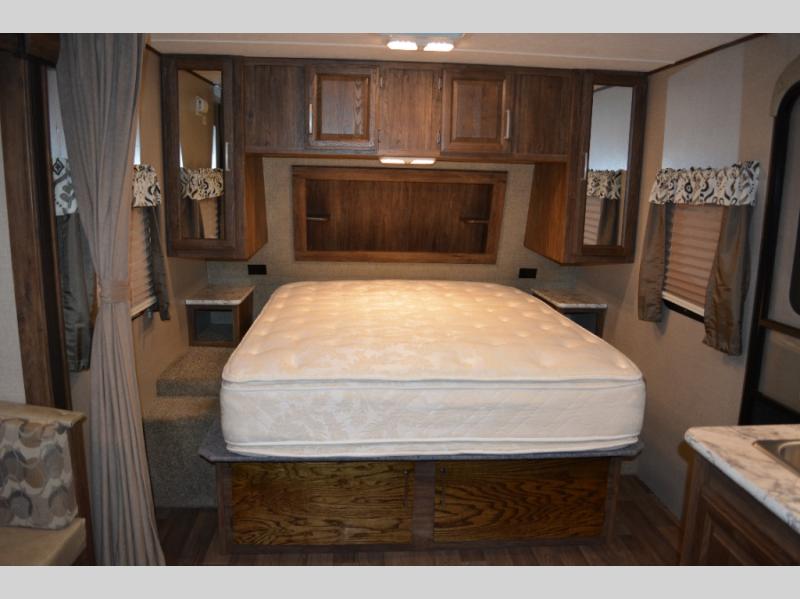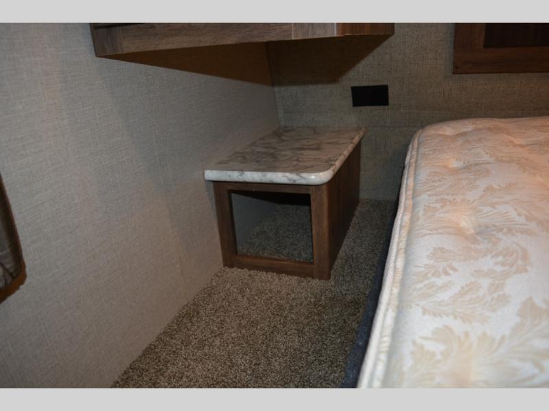 In front find a queen size bed for sleeping with dual bedside wardrobes, plus a laundry chute on the right side. There is also overhead storage, and a front pass through on the exterior just beneath the bedroom, plus so much more!