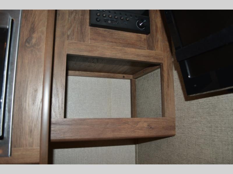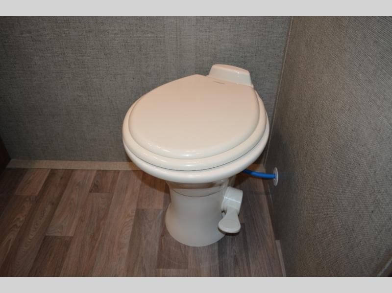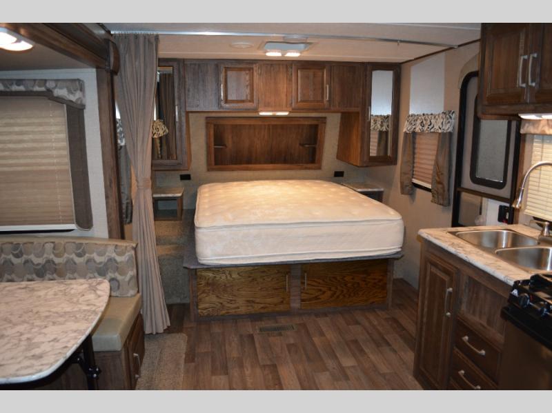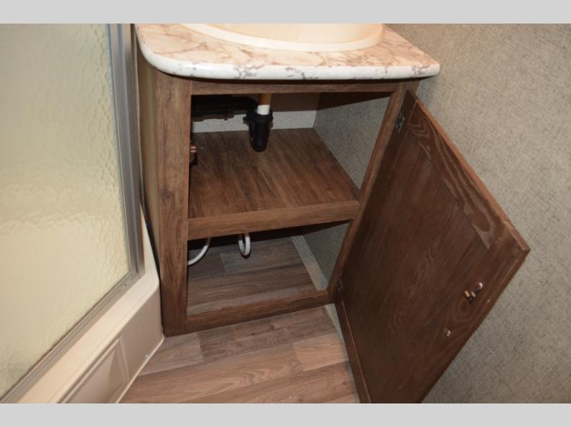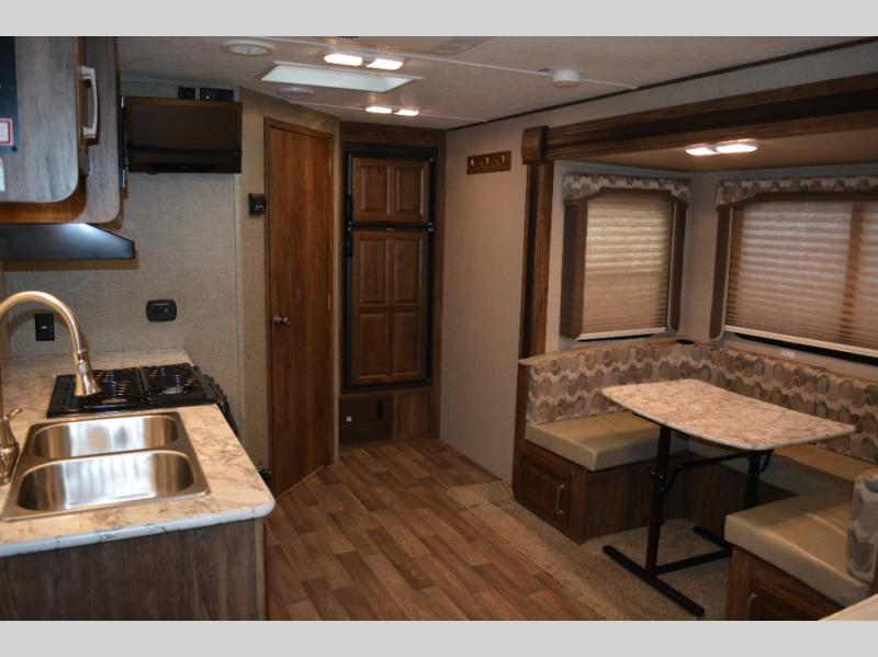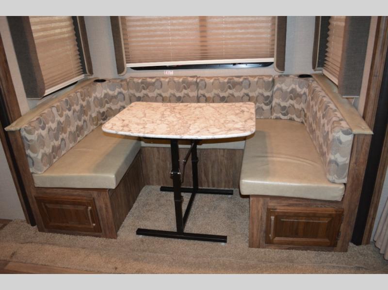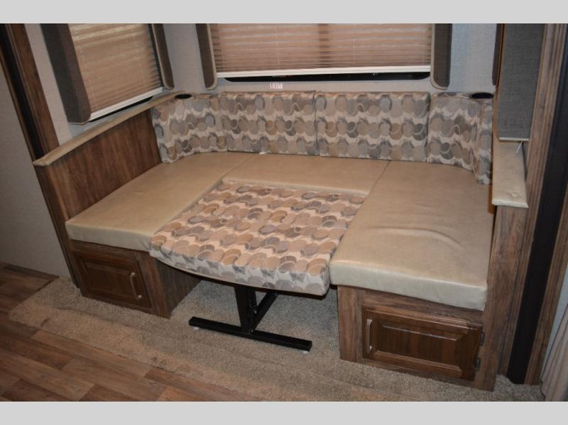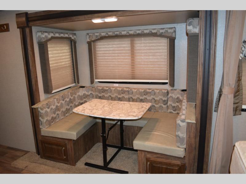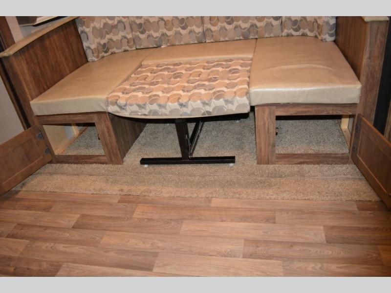 Model 19RBEWE features a slide out u-shaped dinette straight ahead from the side entry door. This provides seating for everyone at mealtime and can also be quickly made into extra sleeping space when needed at night.