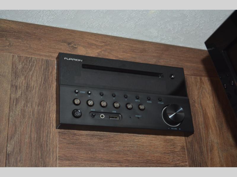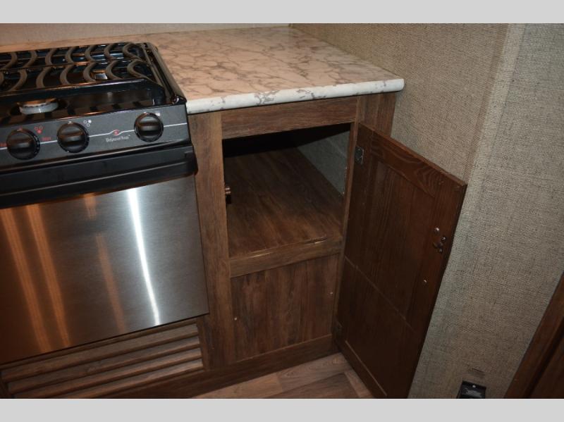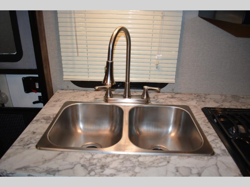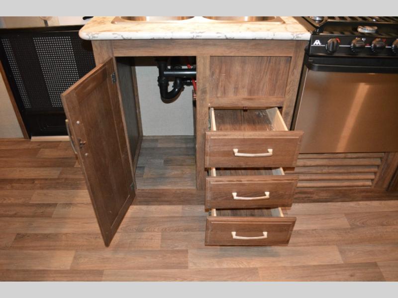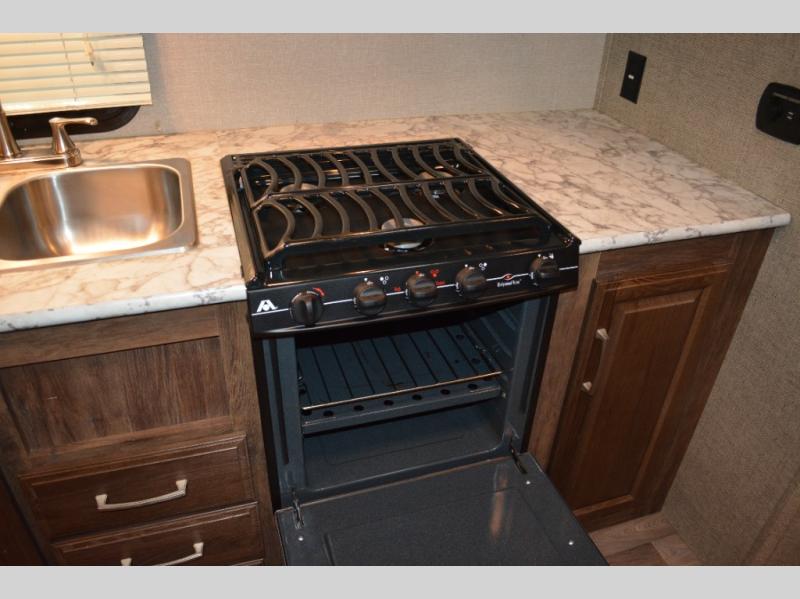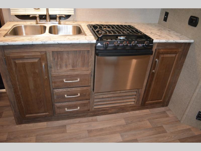 To the left of the door find a kitchen area that provides a double sink, a three burner range, and a little counter space plus storage both above and below. There is also a TV mount above the counter off the exterior bath wall.