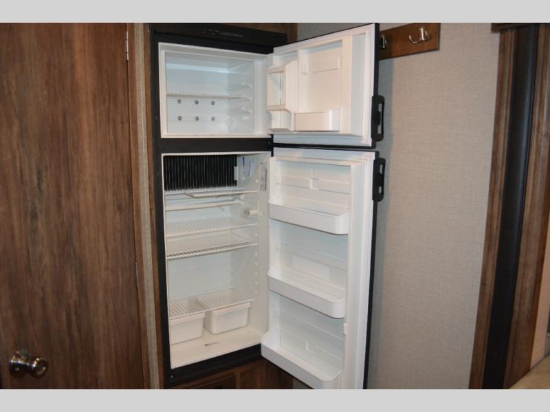 The rear of this unit also features a refrigerator that has been tucked out of the way in the right hand corner.