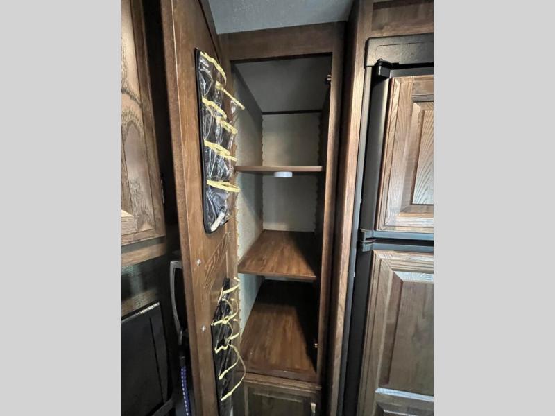 Step inside using the door furthest to the rear where you will find two recliners once inside. There is an end table between the two chairs, and an overhead cabinet the entire width of the unit for stowing away your belongings neatly.