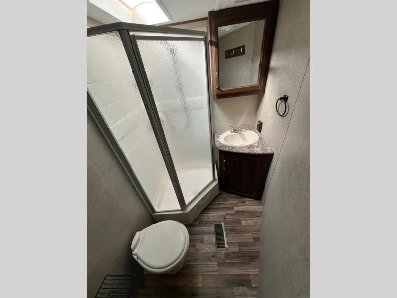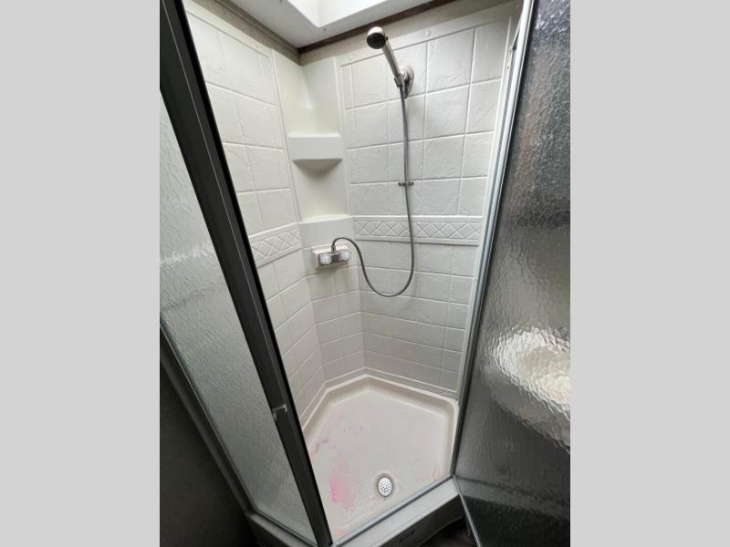 The bathroom is also along the curb side just beyond the kitchen area and offers a convenient neo-angled shower, toilet, and vanity with sink.
