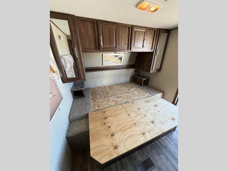 Straight in the door find a slide out hide-a-bed sofa and u-shaped dinette. This provides ample seating for meals, or just simply hanging out, plus it is a great way to add overnight guests and keep them comfortable too. The entertainment center along the angled bathroom wall is in perfect viewing range of the seating here.