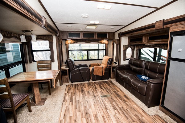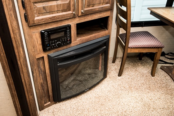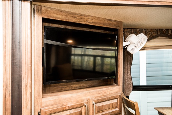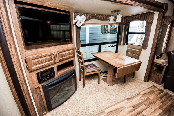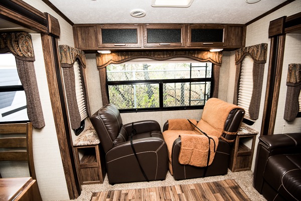 The rear entertainment area features opposing slides to create a large space for gathering. There is a u-shaped dinette with overhead storage on the left with plenty of seating for everyone, plus a sofa. The opposite side features a slide out with two chairs and overhead storage. The entire rear wall entertainment center surrounds a space that is ready with TV hook-ups for an optional 32" TV. On either side of that space, plus below it, you will find more space to store your things.