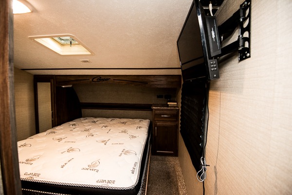 The private front bedroom takes you away from the hustle and bustle of family activity in the main living area creating a space where you can get away to rest peacefully on the queen bed provided. This bedroom includes a slide out wardrobe that also opens up in the bathroom, one bedside wardrobe, one nightstand, and more.