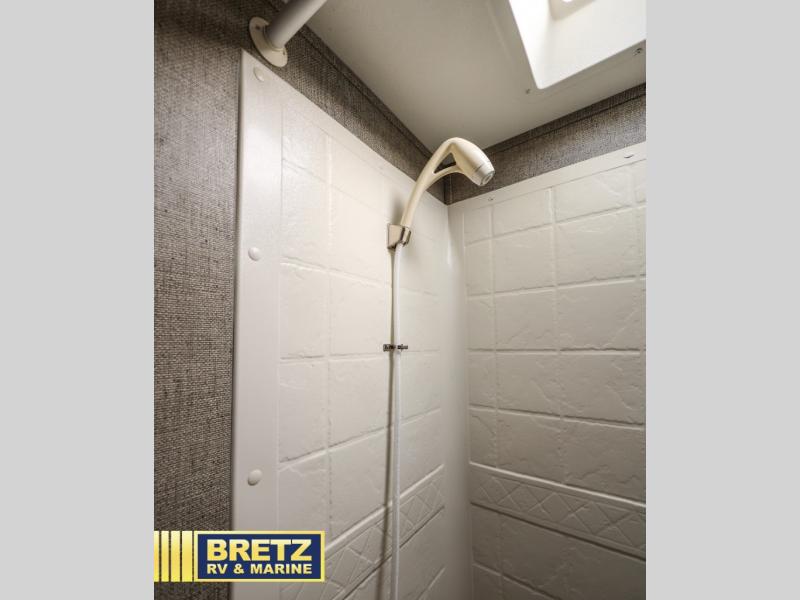 Step inside the entry door and check out the front master bedroom behind the sliding door. Inside find a queen size bed with overhead storage, dual wardrobes, and a laundry chute to keep things neat and organized.