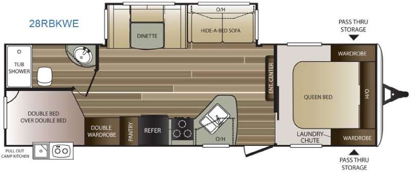 The rear pull out camp kitchen features a refrigerator, a pull out stove top and single sink, plus exterior counter top, and storage. Outside find additional storage for all of your larger camping gear and more in the pass-through storage compartment, plus much much more inside and out!