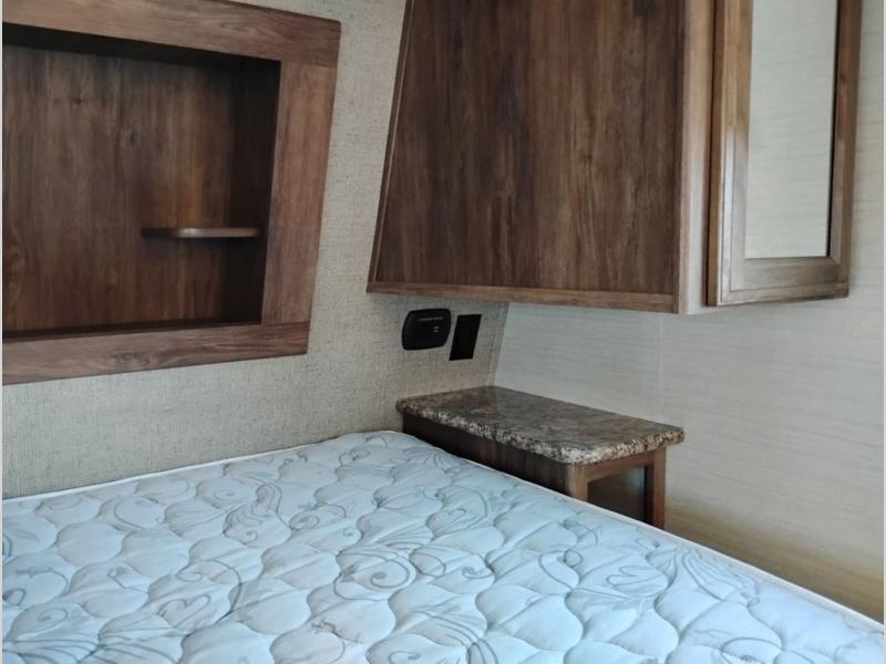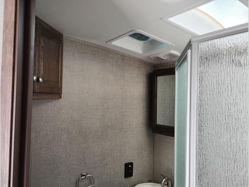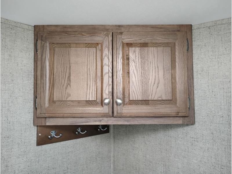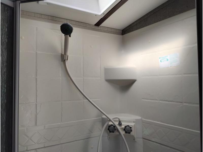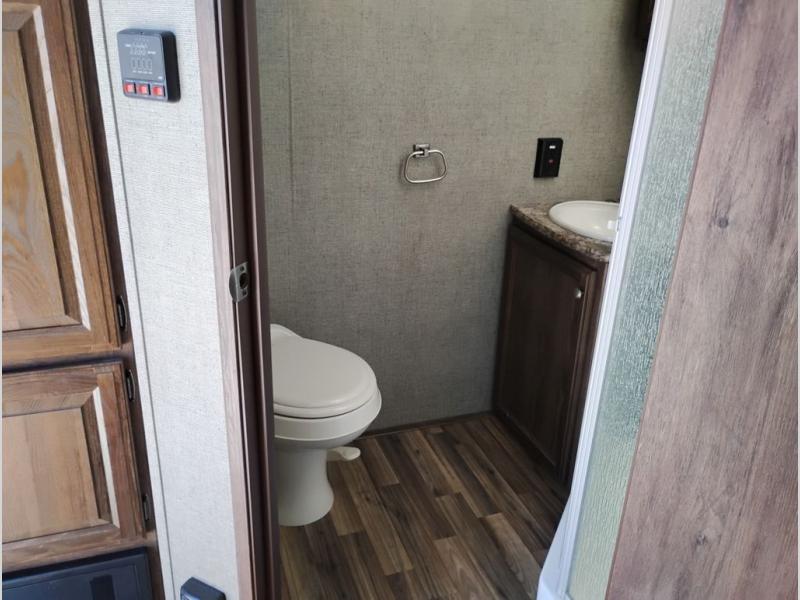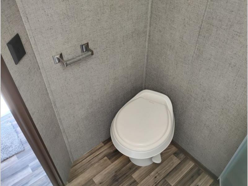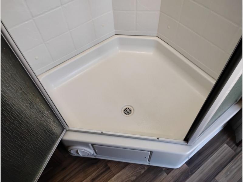 Model 21RBS offers plenty of storage both inside and out starting just inside the side entry door with a closet/pantry on your immediate left. Straight ahead there is a corner bath with neo-angled shower, toilet and sink.