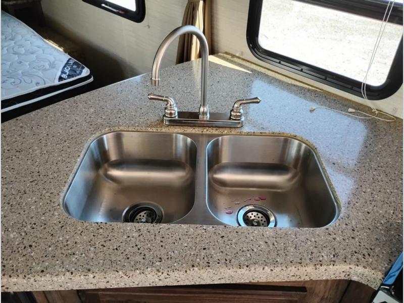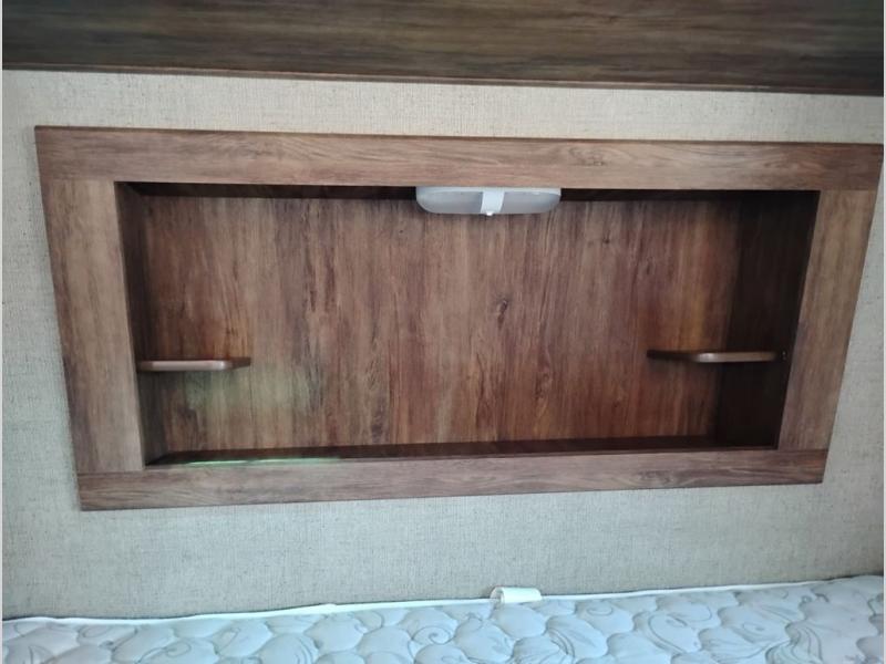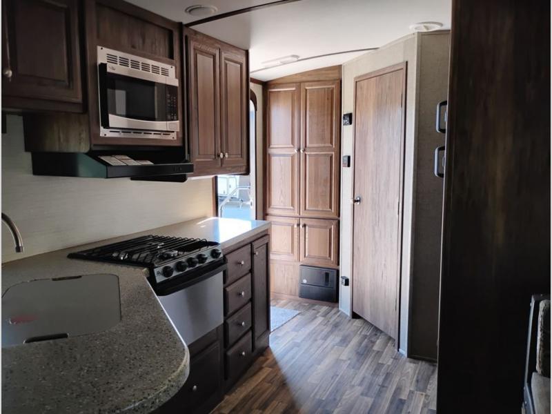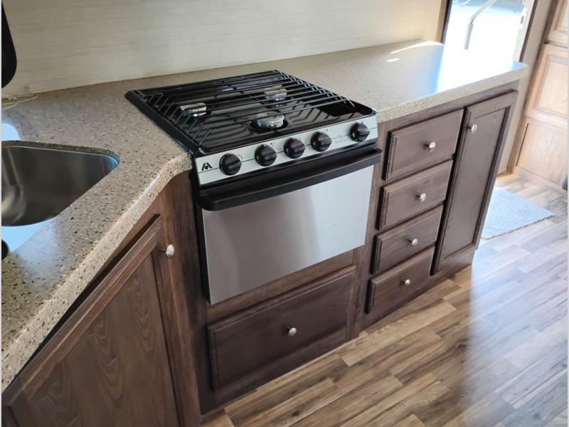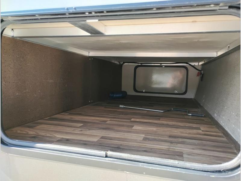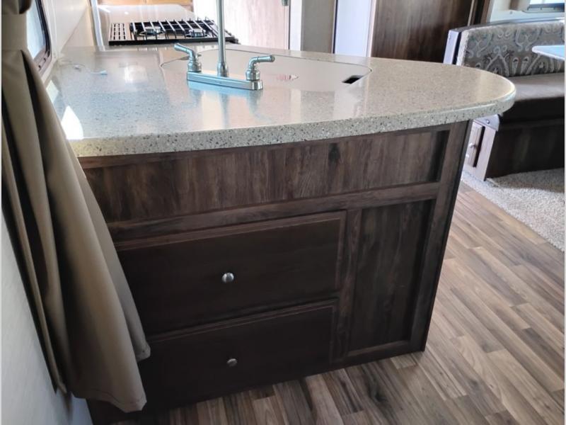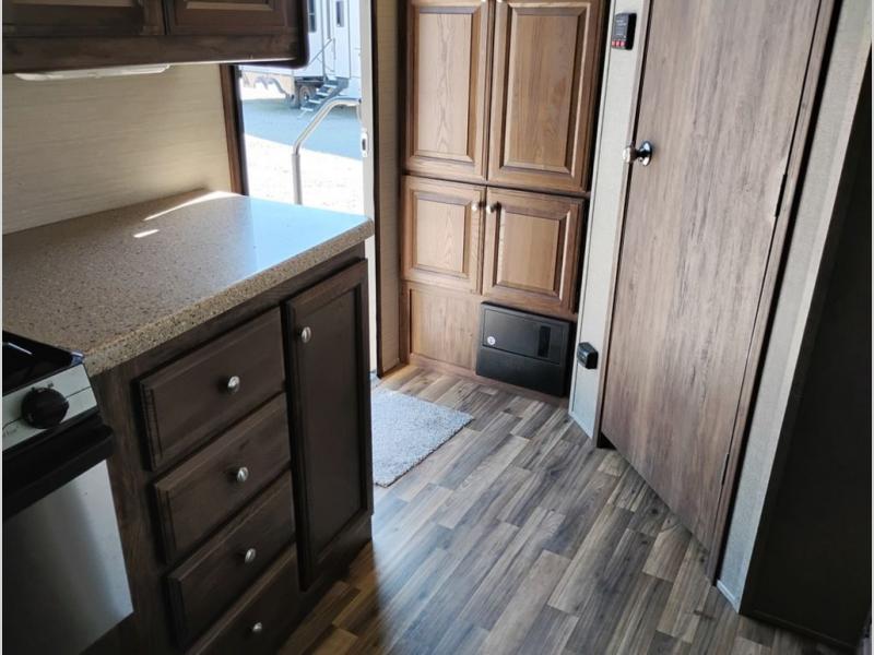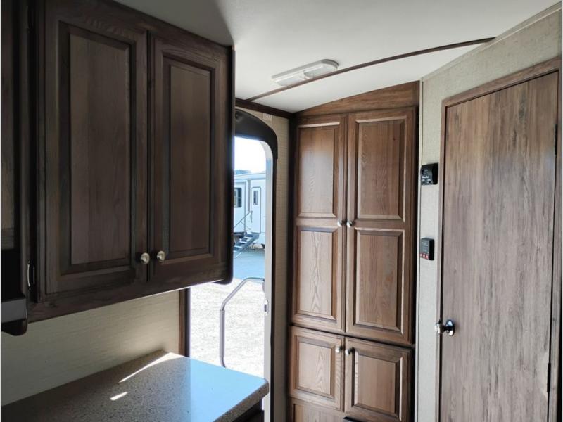 Model 21RBS offers plenty of storage both inside and out starting just inside the side entry door with a closet/pantry on your immediate left. Straight ahead there is a corner bath with neo-angled shower, toilet and sink.
