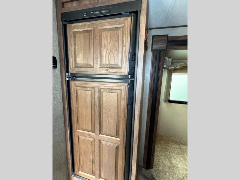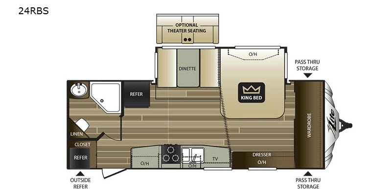 To the left of the entry door there is a bit more counter space for meal prep, a three burner range, double sink, overhead cabinets for dishes, and a TV. The opposite side of the trailer includes a slide out which really helps to open up the floor space. Here you will find a dinette or you can choose optional theater seats with cup holders, and a king bed with an overhead cabinet. Adjacent to the slide out there is a refrigerator for your perishables.