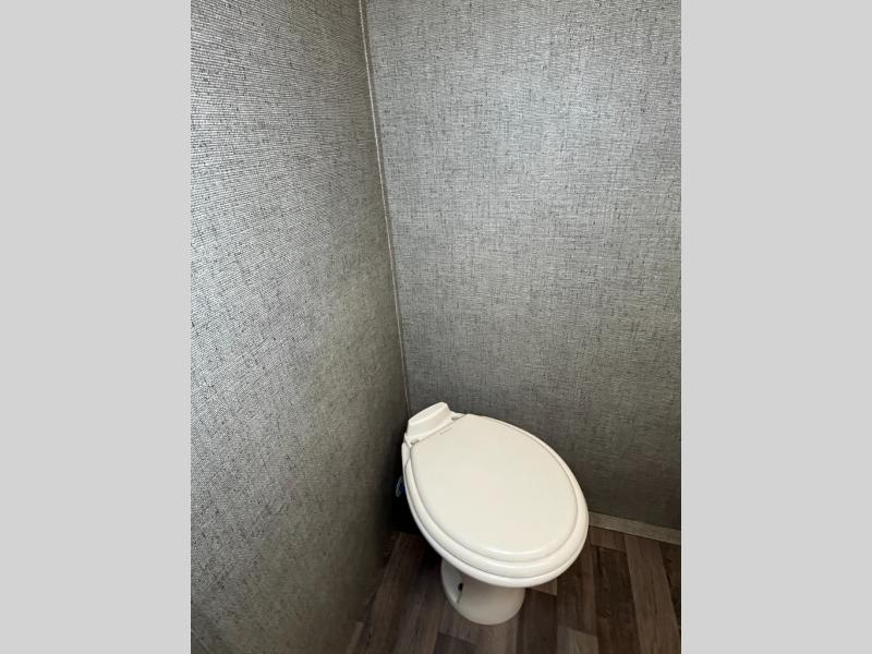 Along the rear wall there is a large closet. Also in the rear of the trailer is where you will find the bathroom with a toilet, corner linen cabinet, sink, and angled shower.