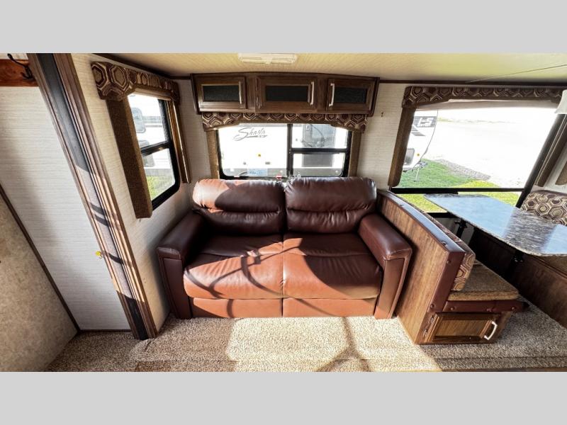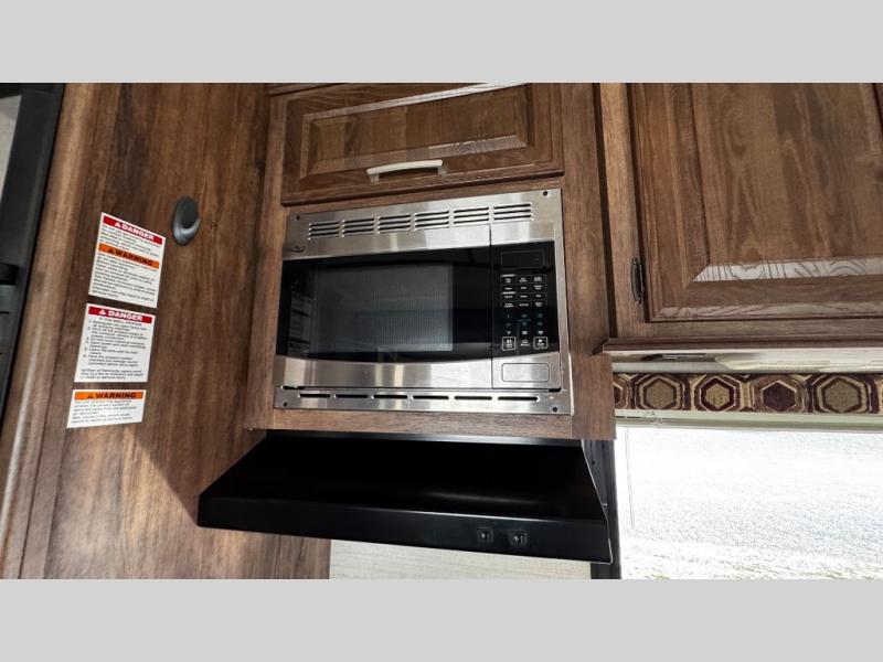 Straight in from the door find a tri-fold sleeper sofa and booth dinette slide, or you can choose an optional free-standing dinette in place of the booth dinette. The sofa features overhead cabinets for storage. There is an entertainment center near the slide that can easily be viewed from any seating in the room.