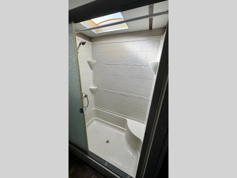 One step up to the front bed and walk-through bath area behind a sliding door. The shower with seat is located on your left and a private toilet area is on the right. Just beyond the toilet area find a separate sink before the bedroom space.