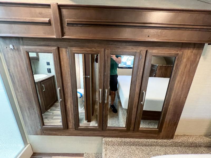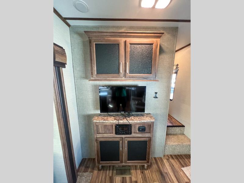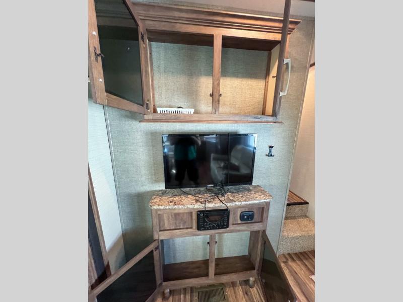 Step inside and see the recliners to the left of the door with storage cabinetry above each, or you can choose optional theater seats. There is an entertainment center straight ahead through the door plus space to store things above and below.