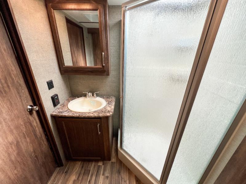 The rear of the unit offers a kitchen with all the amenities you need to prepare and cook food for your family. There is a refrigerator, double kitchen sink, a three burner range, and pantry with overhead storage.
