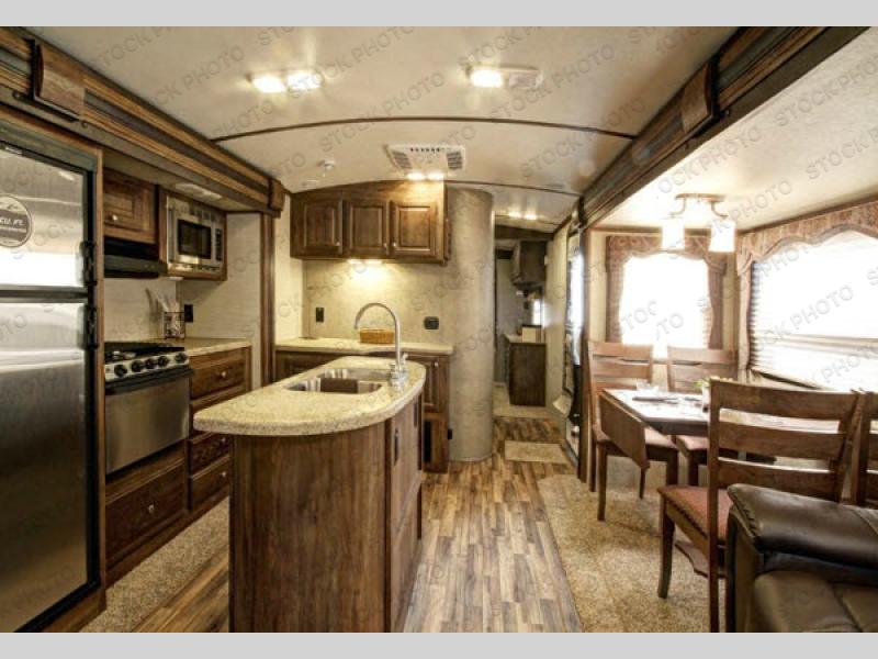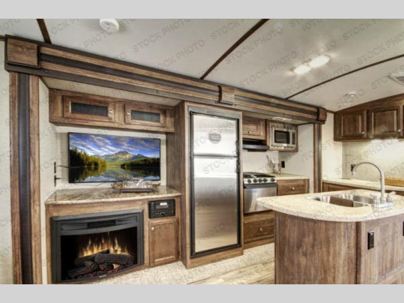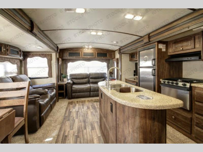 Back in the main living and kitchen space find a free standing dinette with theater seats, cup holders, and storage above, or you can choose an optional booth dinette and optional recliners. Continuing around to the rear wall find a tri-fold sleeper sofa with two end tables and storage above. The second slide in this area features an entertainment center, and the kitchen appliances. You will enjoy having extra sleeping space with the sleeper sofa for guests.